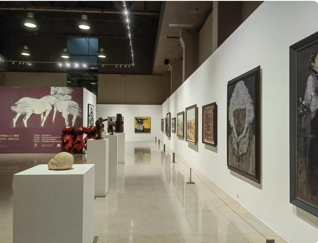 陈列在展厅空间的雕塑作品与墙面上的油画作品相映生辉,同构成了展览的整体阵容,如一股北疆吹来的清风,在美术馆散发出北方草原的特有气息。展览共展出油画系28位教师和雕塑系11位教师(包括退休、历任和在职教师)的代表性作品137件(套),围绕北疆文化的丰富内涵和地域文化特色,展现其70年来富有中国叙事特色的油画·雕塑艺术创作成果。