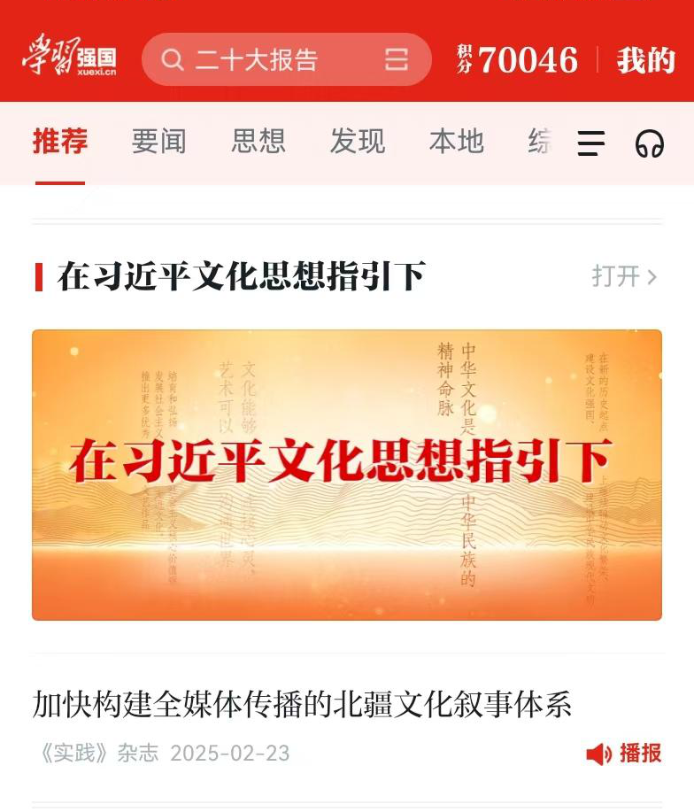 2月23日,中宣部“学习强国”平台全文刊载beat365新闻传播学院曹国东老师的理论文章《加快构建全媒体传播的北疆文化叙事体系》(原文刊于《实践》杂志2025年第1期),截至2月26日,阅读数超510万,点赞量26万余次。