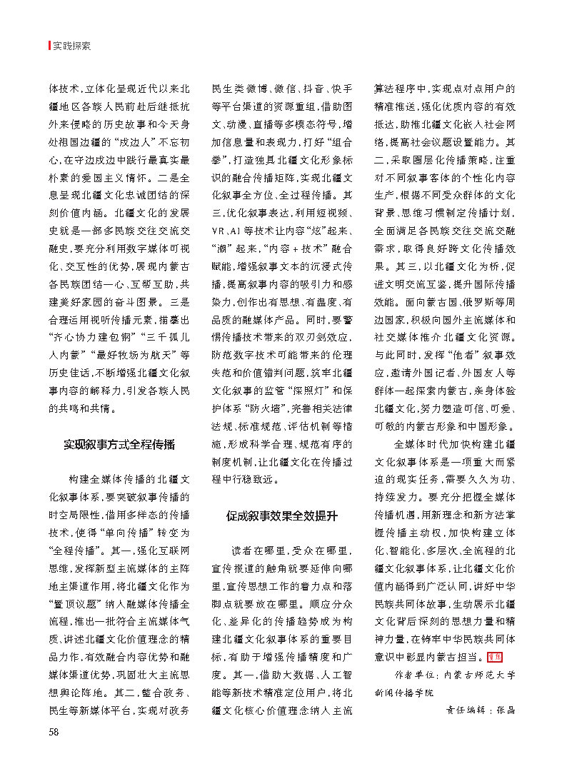 文章结合习近平总书记提出的“全媒体传播体系”重要论述,从全程媒体、全息媒体、全员媒体和全效媒体四个维度,对北疆文化传播的实践路径进行了深刻诠释。新时代的北疆文化传播秉持创新思维和系统理念,用全媒体方式掌握传播主动权,构建全链条、智能化、多维度叙事体系,着力提升传播效能,讲好中华民族共同体故事,展现中华文化的深厚底蕴,不断增强北疆文化传播力影响力,推动北疆文化走向世界。