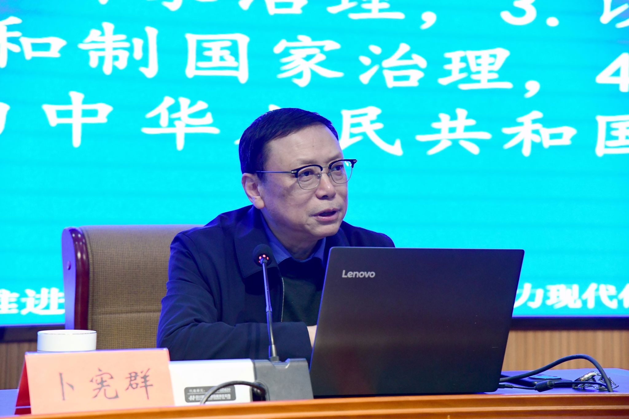 中国社会科学院学部委员、古代史研究所研究员、中国社会科学院大学卜宪群受邀作题为“中国古代国家治理模式对推进党和国家治理体系与治理能力现代化的启示”的专题辅导。卜宪群就中国历史上国家治理的主要思想与措施进行了深入解读,阐述了中国历代治理的智慧与经验,总结了中国历史上的治理实践及其启示,以历史学者的视角分析了如何推进国家治理体系和治理能力现代化。讲座高屋建瓴、鞭辟入里,为大家更好理解习近平新时代中国特色社会主义思想与中国古代国家制度和治理体系的关系,准确把握国家治理体系和治理能力现代化的丰富内涵,提供了细致全面的科学指导。