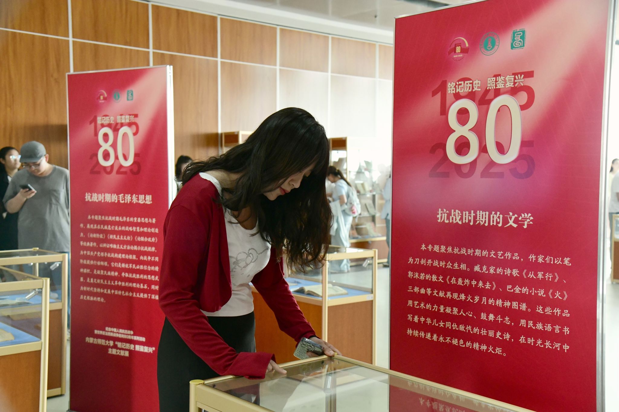 开展仪式上,文学院学生详细介绍了“历史之镜”和“精神之光”两大展区,并分别围绕“抗战时期的毛泽东思想”“抗战时期的红军”“抗战时期的通讯”“抗战时期的文学”四大核心主题,进行了生动详实的讲解,成功地将文献珍品所承载的家国情怀传递给现场观众。师生们参观了相关的文献及图片资料,深刻感受到了和平的来之不易。