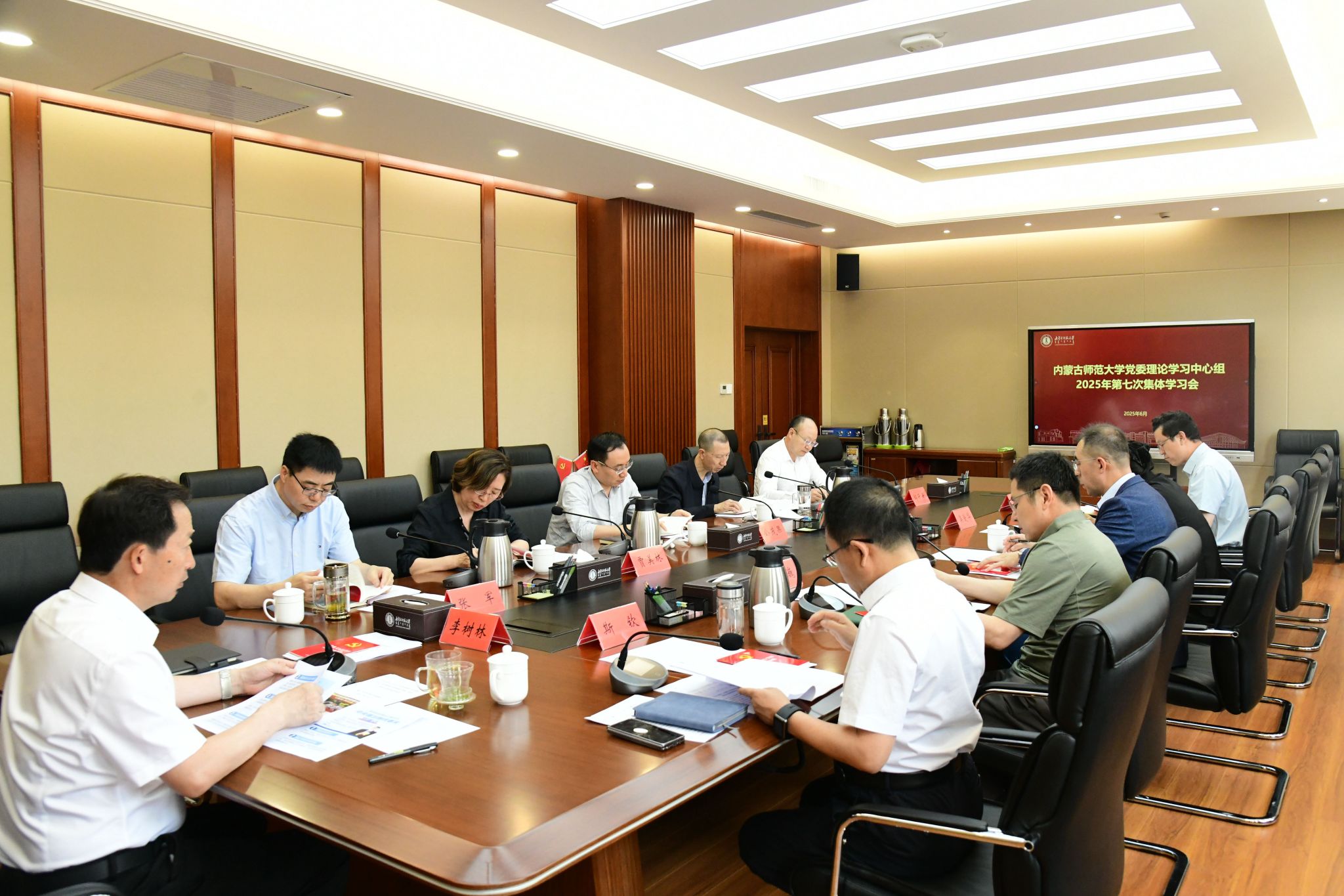 本网讯 6月12日,校党委理论学习中心组在盛乐校区行政楼306会议室举行2025年第七次集体学习,集中学习了新修订的《党政机关厉行节约反对浪费条例》等文件精神,落实中央和自治区党委关于集中整治违规吃喝的部署要求。校党委书记李树林主持会议并讲话,校党委理论学习中心组成员围绕学习主题进行研讨交流。