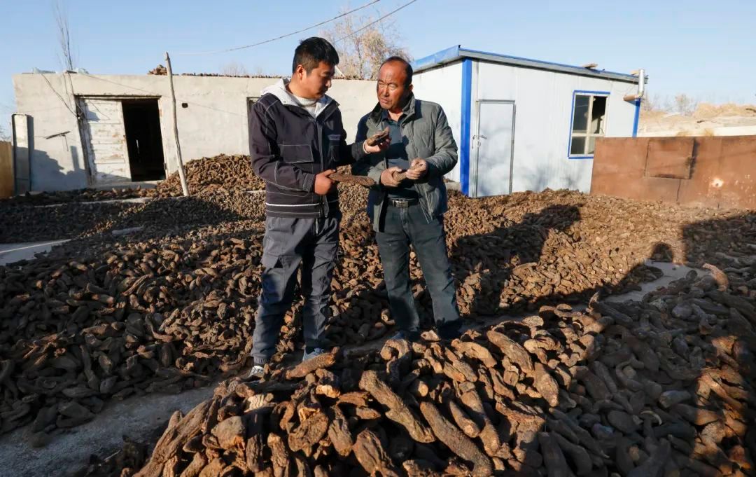 ▲ 麦麦提向前来收购大芸的商户介绍自家种植晾晒的大芸。数日前,环绕塔克拉玛干沙漠边缘全长3046公里的绿色阻沙防护带实现全面锁边“合龙”。在政策支持激励下,和田地区已有8277户群众承包沙地41.2万亩,14家农民合作社和33家企业参与防沙治沙。 新华社记者 王菲 摄