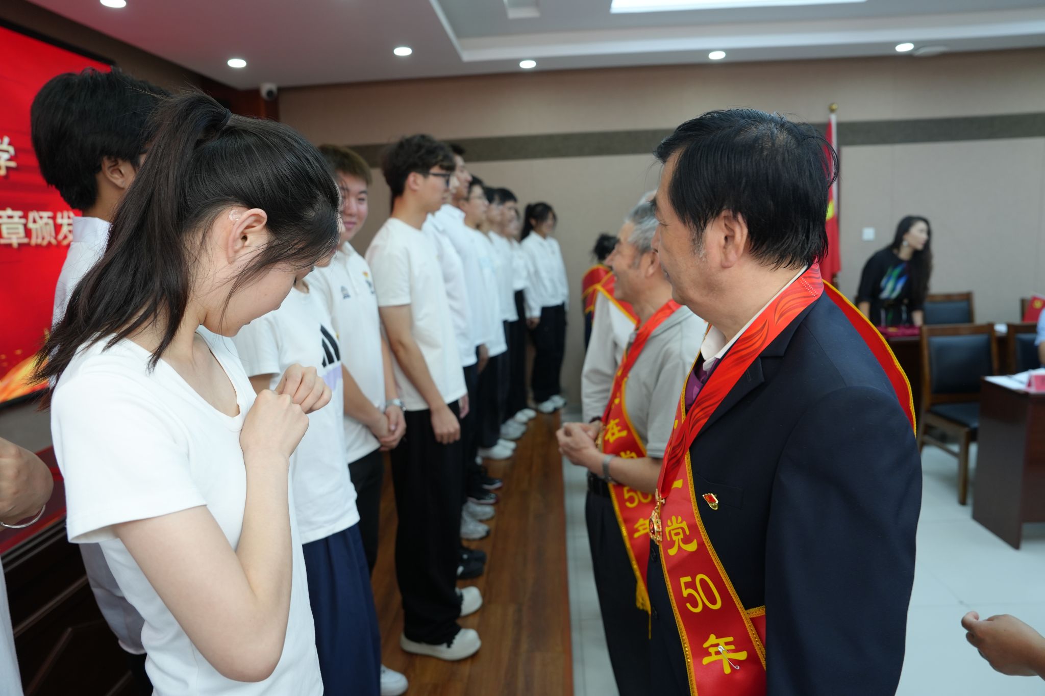 老党员为新党员代表佩戴党员徽章