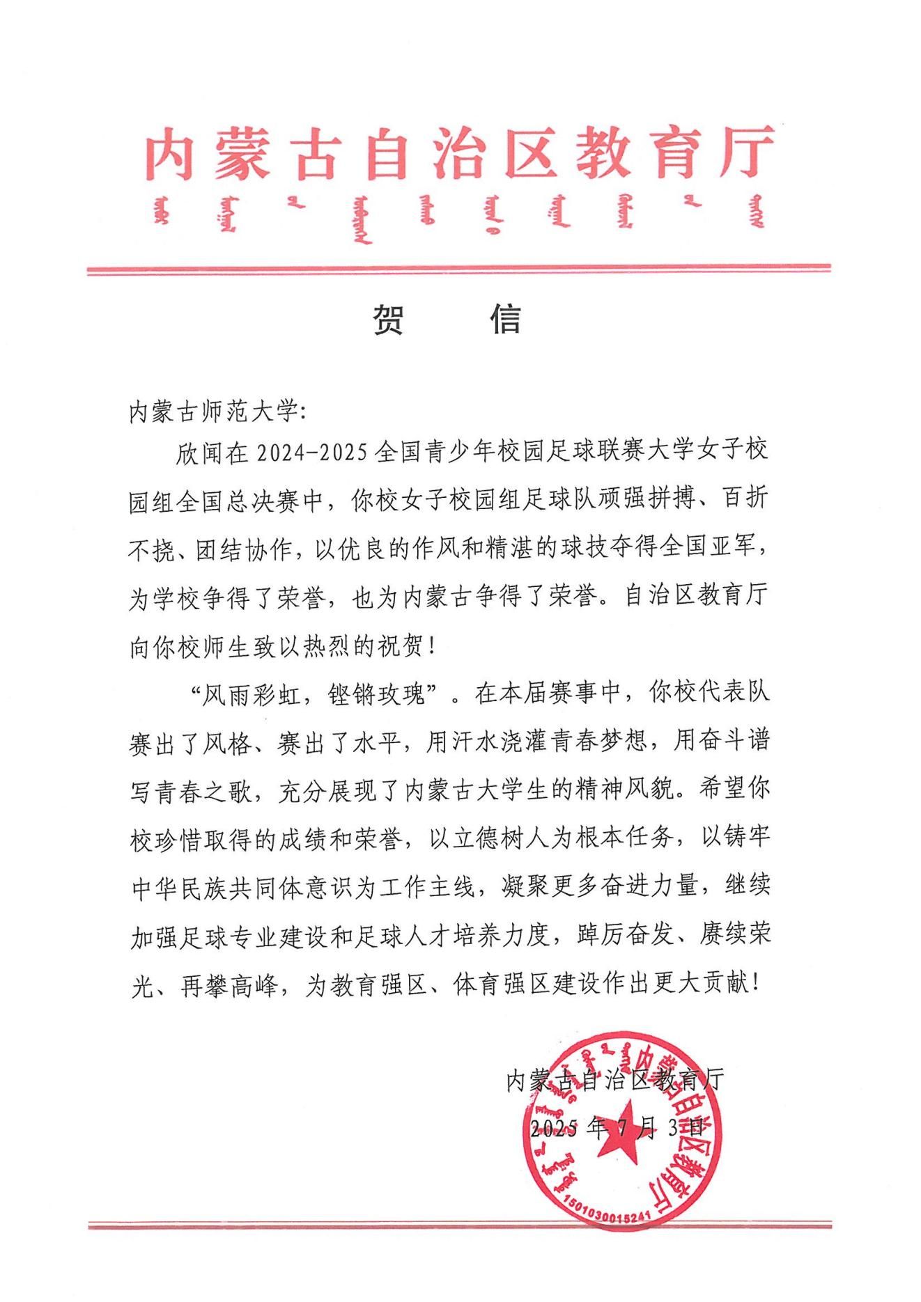 未来,beat365足球队将以此为新起点,持续精进技术水平,不断提升自身实力,力争在更高水平的赛事中再创佳绩,努力为学校和内蒙古自治区的校园足球事业增光添彩。学校也将以此为契机,持续优化训练条件和竞赛环境,为运动员提供更加专业的成长平台,推动校园足球运动向更高水平发展,让体育育人成为培养德智体美劳全面发展人才的重要支撑。