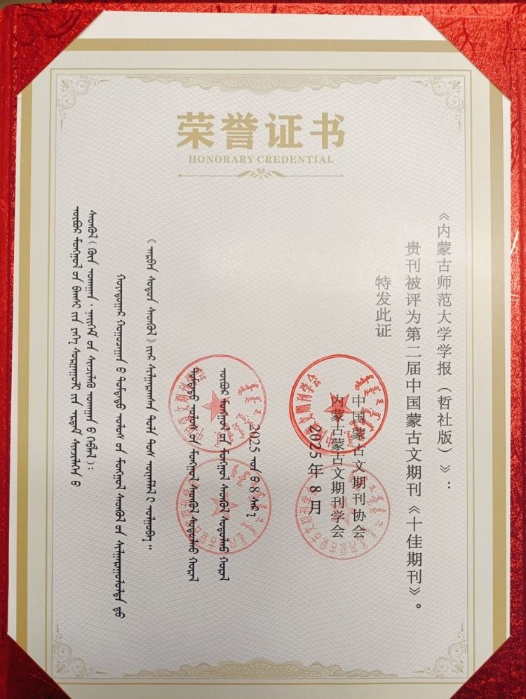 本网讯 8月29日至31日,蒙古文期刊界学习贯彻习近平文化思想专题培训会暨中国(内蒙古)蒙古文期刊学会第39次年会在鄂尔多斯市举办。会议期间,举行了第二届中国蒙古文期刊“十佳期刊”颁奖仪式,《beat365在线唯一官网学报(哲学社会科学版蒙古文)》荣获该项殊荣。