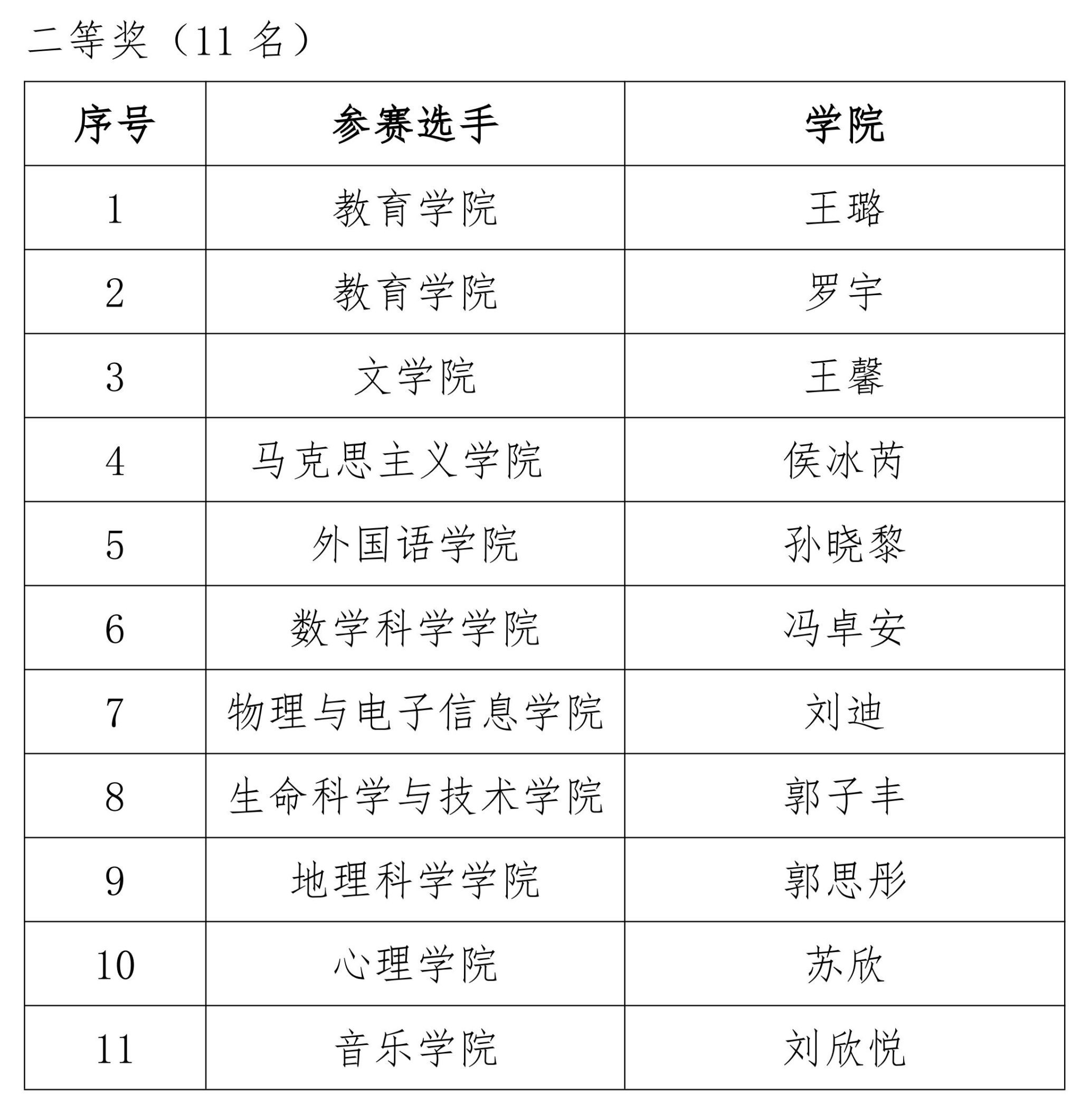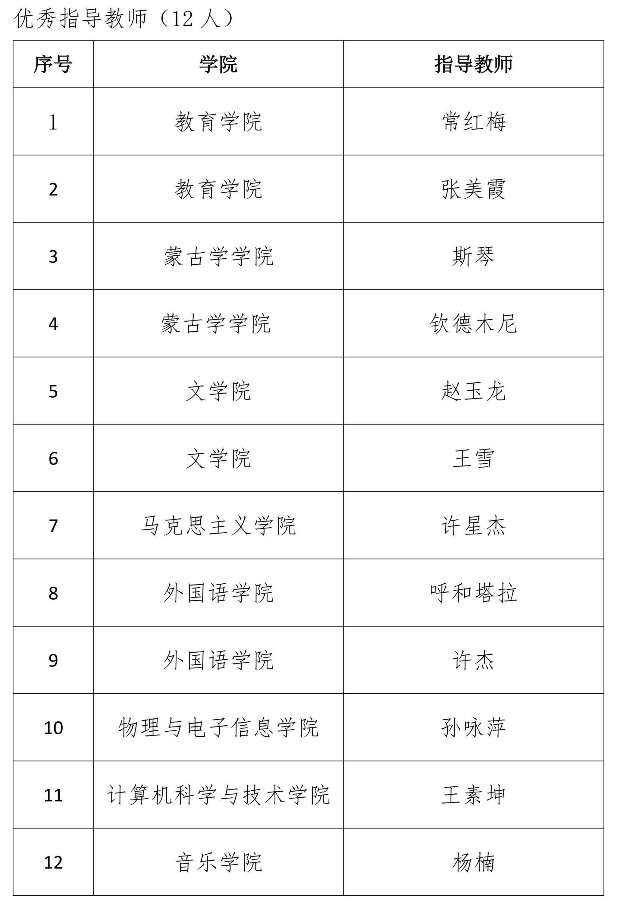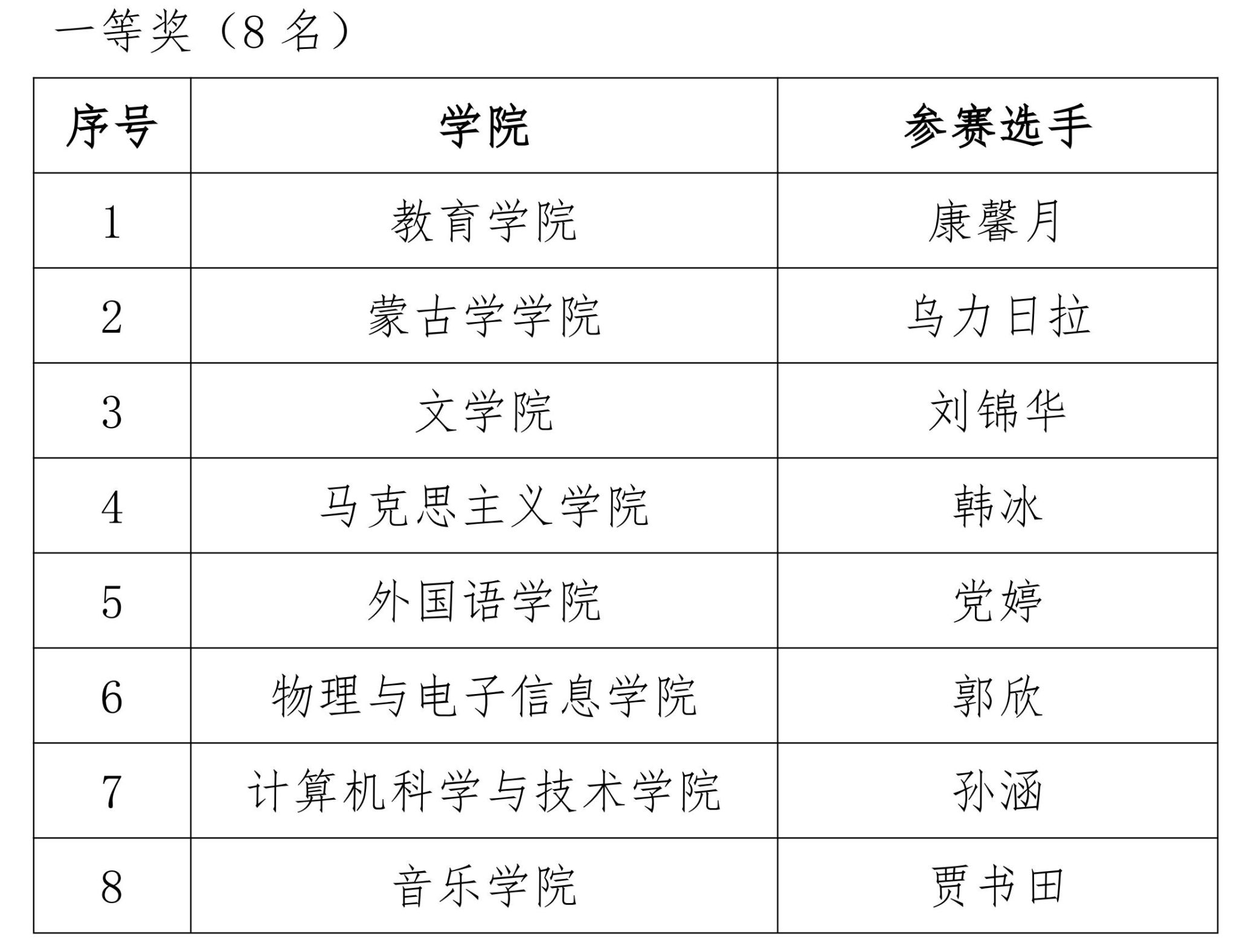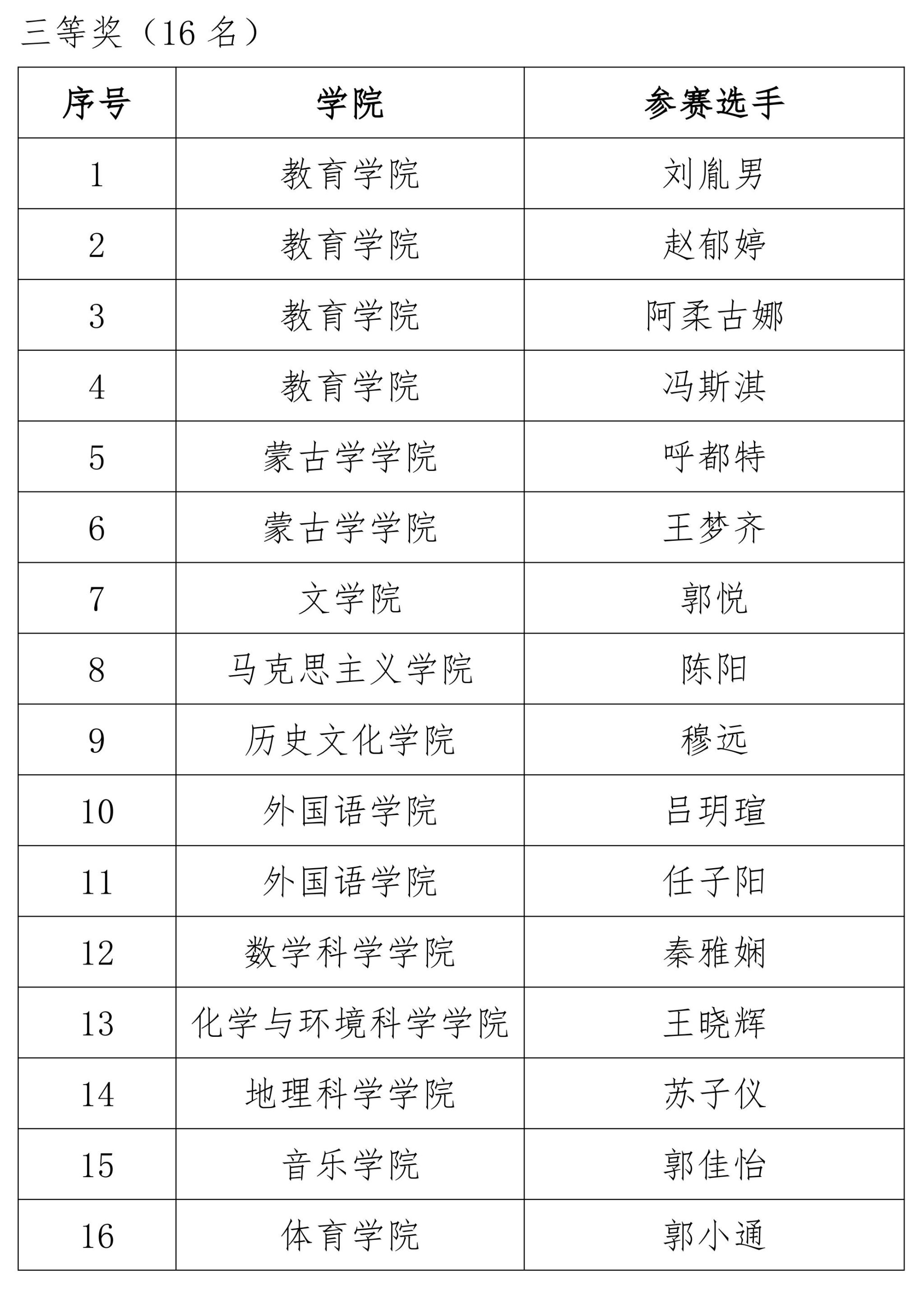 经过激烈角逐,教育学院康馨月等8名同学获得一等奖,文学院王馨等11名同学获得二等奖,蒙古学学院呼都特等16名同学获得三等奖,马克思主义学院苏晨睿等18名同学获得优秀奖;外国语学院呼和塔拉等12名教师获得“优秀指导教师”称号;数学科学学院等6个学院获得“优秀组织奖”。