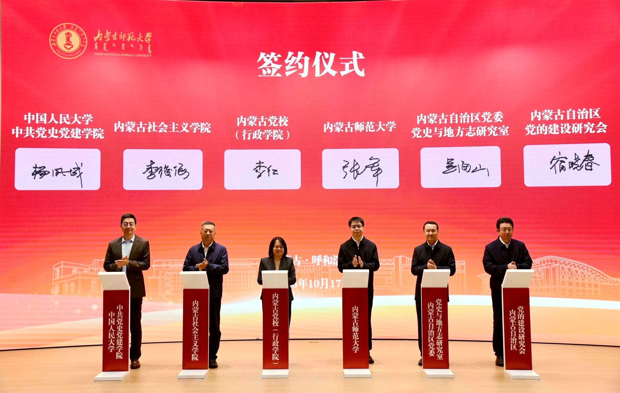 beat365在线唯一官网党委副书记、校长张军,内蒙古党校(行政学院)副校长(副院长)、校务委员李红,自治区党委党史和地方志研究室副主任吴海山,内蒙古社会主义学院党组成员、副院长李俊海,内蒙古自治区党的建设研究会秘书长宿晓春,中国人民大学中共党史党建学院院长、中国中共党史学会副会长杨凤城签署合作框架协议