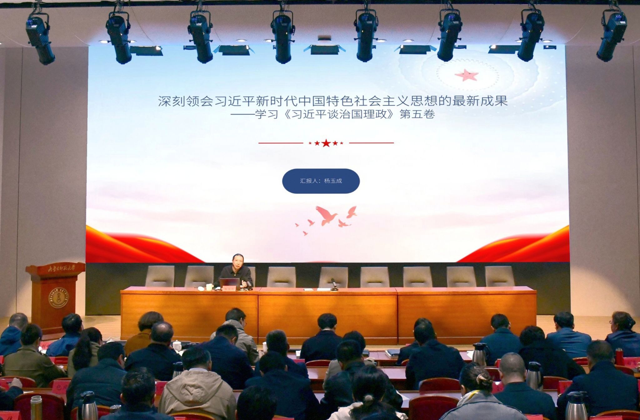 杨玉成从《习近平谈治国理政》第五卷的整体框架、贯穿《习近平谈治国理政》第五卷的马克思主义世界观和方法论、中国式现代化理论和人类文明新形态、加强党中央集中统一领导和推进党的自我革命四个方面,进行了系统透彻、深入浅出的解读,强调要把握好习近平新时代中国特色社会主义思想的世界观和方法论,坚持好、运用好贯穿其中的立场观点方法,自觉用以武装头脑、指导实践、推动工作,做到真学真懂真信真用,使广大领导干部更加全面了解和系统把握了《习近平谈治国理政》第五卷的深刻内涵。