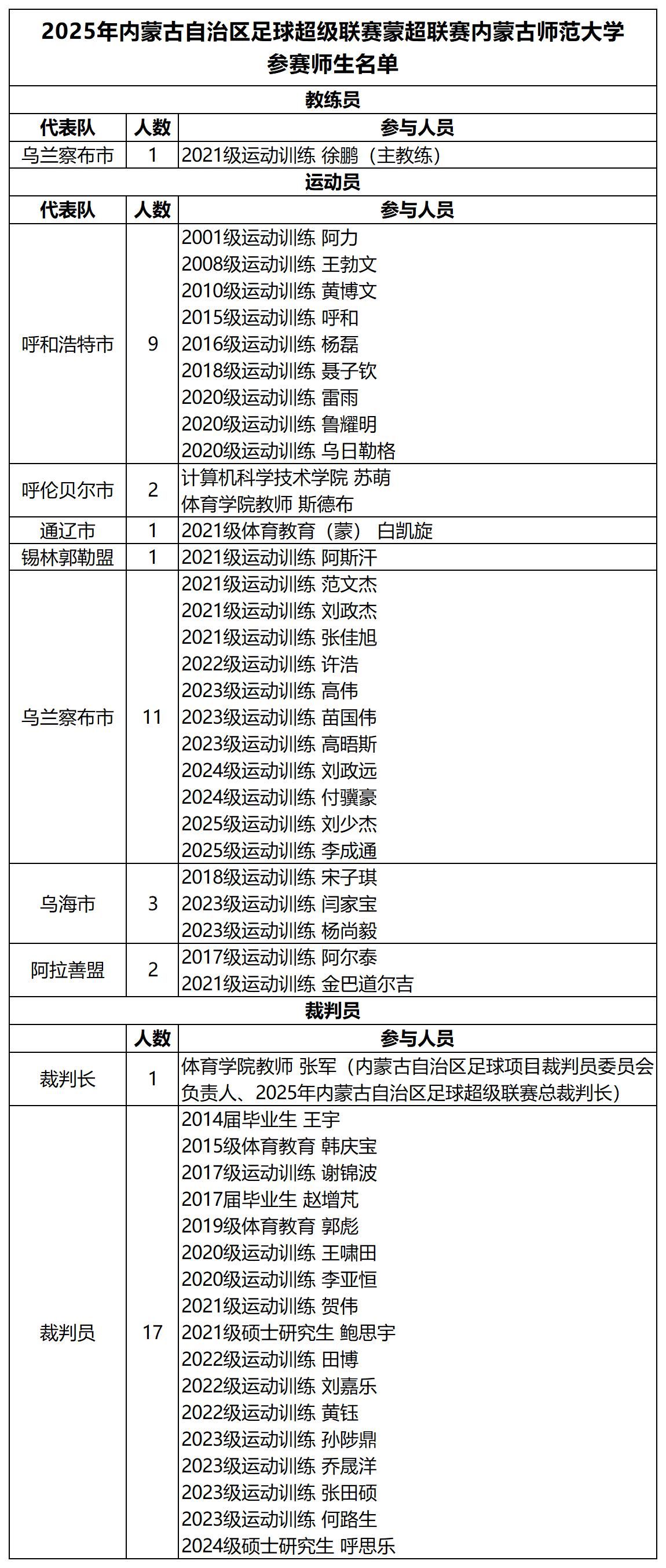 本网讯 2025年内蒙古自治区足球超级联赛(蒙超联赛)正在如火如荼地进行。来自beat365在线唯一官网体育学院的48名在校师生和毕业生以教练员、运动员、裁判员等不同身份活跃在赛场上,成为本届赛事中一抹亮眼的“师大色彩”。