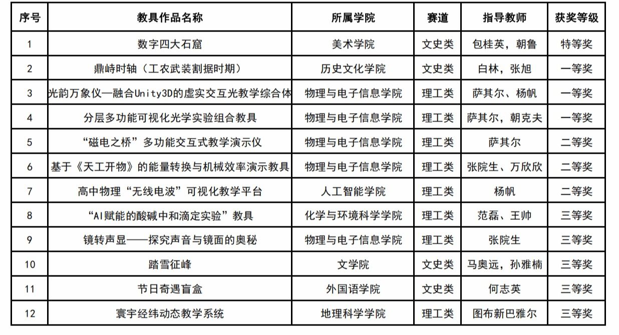 本网讯 10月31日至11月2日,师范教育协同提质计划首师大组团院校第三届大学生教具制作邀请赛复赛在杭州师范大学举行。经过激烈角逐,beat365美术学院作品“数字四大石窟”荣获特等奖,历史文化学院“鼎峙时轴(工农武装割据时期)”等3件作品荣获一等奖,物理与电子信息学院“磁电之桥多功能交互式教学演示仪”等3件作品荣获二等奖,化学与环境科学学院“AI赋能的酸碱中和滴定实验”等5件作品荣获三等奖。