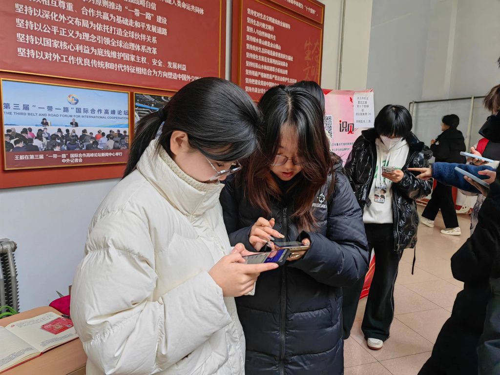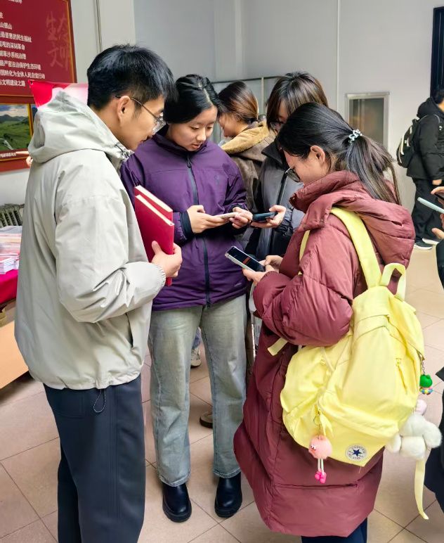 在互动体验环节,前来交流的青年学子们纷纷扫码下载“学习强国”APP,体验竞赛“答题”赢取“强国文创”,在“双人对战”“四人赛”答题比赛中,你来我往高低难分,不到最后一题胜负难定的求胜欲考验着对战各方的知识储备、心理素质、应变能力,既充满趣味又略显紧张。刚体验完“双人对战”并胜出的2024级马克思主义学院法学专业张雅妮同学高兴地说道:“答题太有意思了,特别是‘双人对战’,让我既增长了知识,又体验了竞赛的乐趣,而且这种小型的竞赛也便于我跟同学随时随地比拼。”