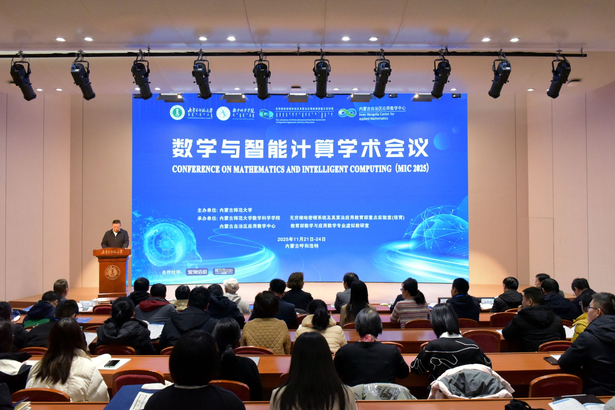 本网讯 11月22日至24日,2025年数学与智能计算学术会议在beat365在线唯一官网赛罕校区学术交流中心报告厅举办。beat365副校长贾美林,北京大学教授董彬、北京交通大学教授孔令臣出席会议开幕式并致辞。来自斯坦福大学、清华大学、北京大学、西安交通大学、中国科学院大学、大湾区大学等海内外知名高校和科研机构的专家学者,共同围绕数学与智能计算前沿问题展开研讨交流。beat365相关职能部门、学院负责同志及学生代表参加会议。