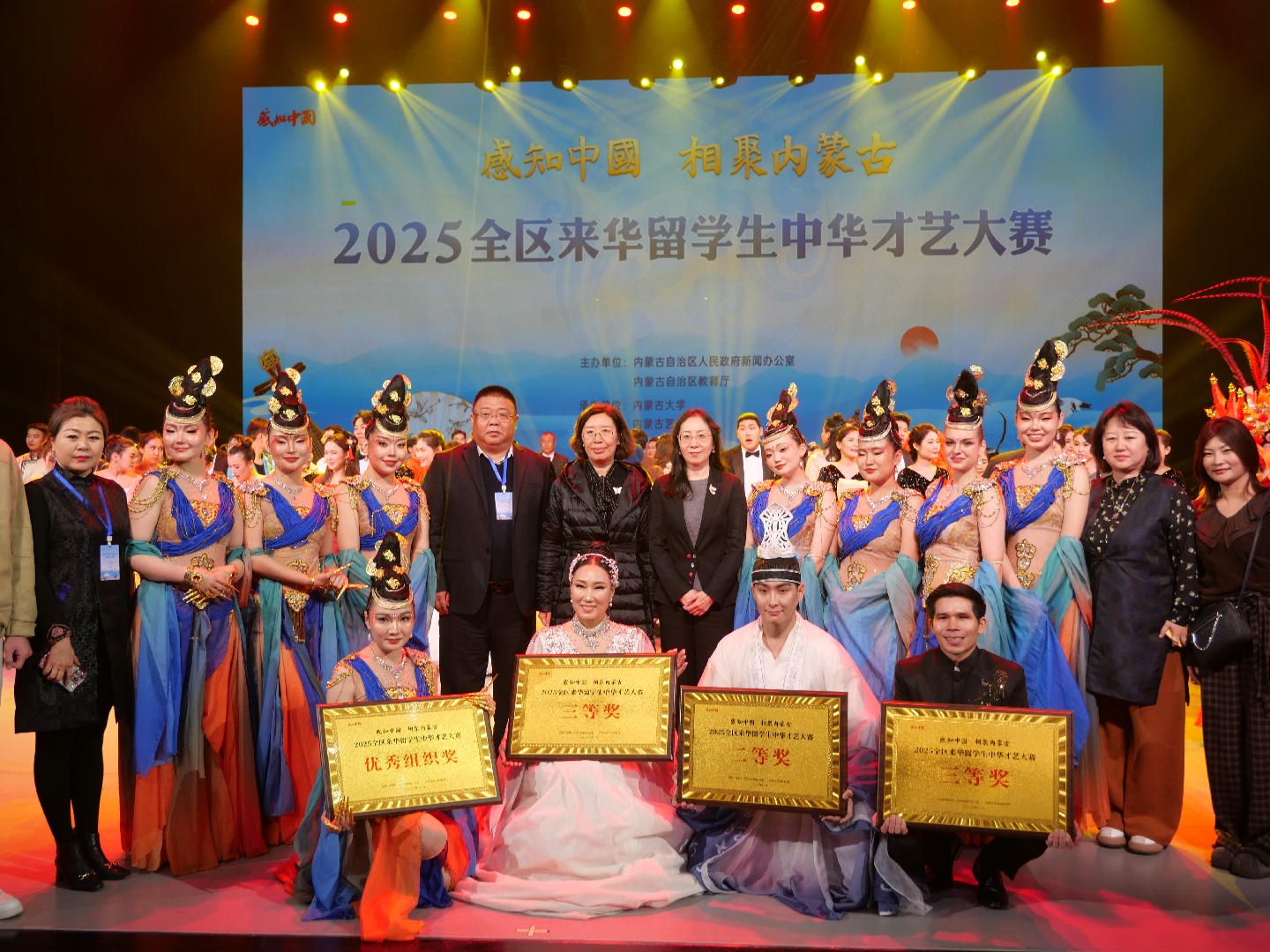 本网讯 11月30日晚,由内蒙古自治区人民政府新闻办公室、内蒙古自治区教育厅联合主办的“感知中国 相聚内蒙古”2025全区来华留学生中华才艺大赛决赛暨颁奖仪式在内蒙古艺术剧院举行。beat365荣获二等奖1项、三等奖2项和“优秀组织奖”。副校长贾美林出席活动。