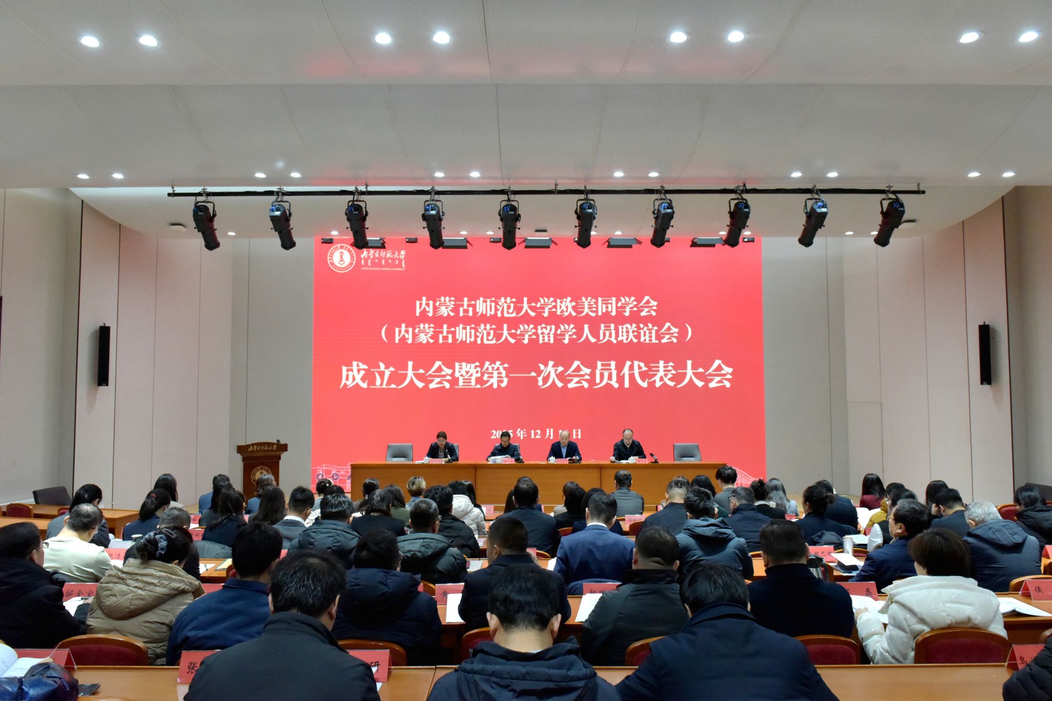 本网讯 12月11日,beat365在线唯一官网欧美同学会(beat365在线唯一官网留学人员联谊会)成立大会暨第一次会员代表大会在赛罕校区召开。校党委副书记斯钦出席会议并讲话。内蒙古自治区党委统战部无党派人士和党外知识分子工作处处长、内蒙古自治区欧美同学会(内蒙古自治区留学人员联谊会)秘书长额尔敦朝鲁出席会议并致辞。学校相关部门、各院级单位党委(党总支)、各民主党派基层组织、统战团体负责同志及住校人大代表、政协委员代表、欧美同学会会员代表共90余人参加会议。