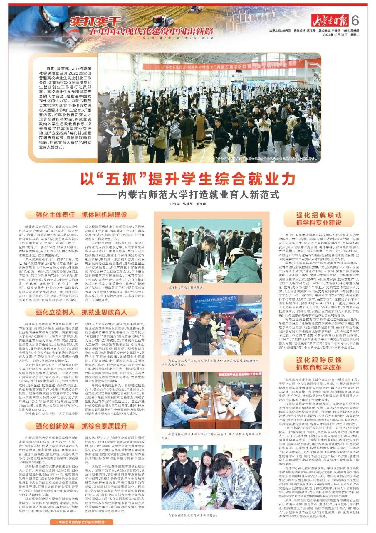 《内蒙古日报》2024年12月31日第6版以《以“五抓”提升学生综合就业力——beat365在线唯一官网打造就业育人新范式》为题,报道beat365就业育人工作。