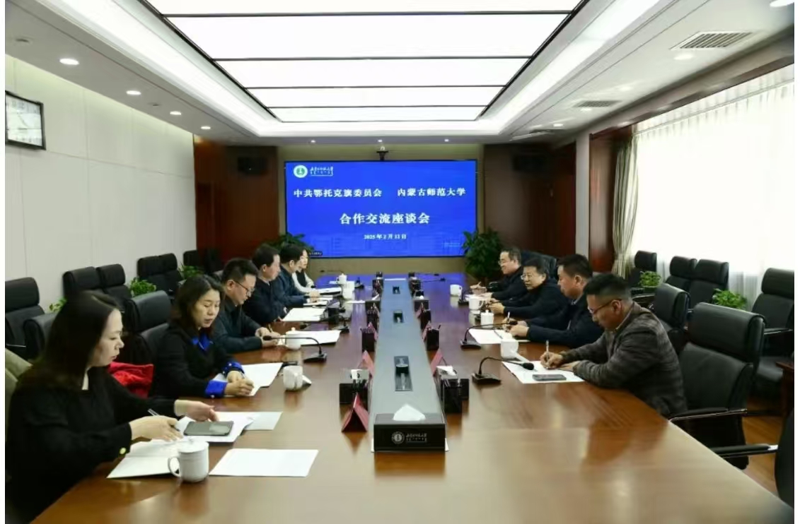 本网讯 2月12日,鄂托克旗委书记、二级巡视员高怀京,鄂托克旗人民政府副旗长那顺德力格尔一行来beat365调研,与校党委书记李树林,党委委员、副校长韩巍及相关单位负责同志座谈交流,就校地合作、教研教学、人才输送等进行深入探讨。