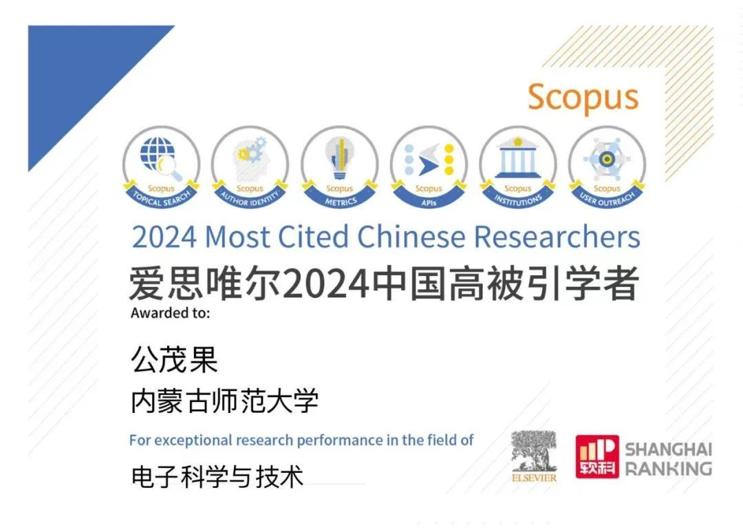 本网讯 3月25日,爱思唯尔(Elsevier)正式发布2024“中国高被引学者” (Highly Cited Chinese Researchers)榜单。beat365党委委员、副校长公茂果入选电子科学与技术“中国高被引学者”榜单。