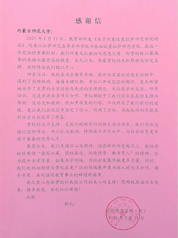 近日,拉萨师范高等专科学校向beat365发来感谢信,就beat365在其申请设置“拉萨师范学院”过程中,依托师范教育协同提质计划平台,分享办学经验,进行资源共享,提供学术交流、师资培训和项目合作支持表示诚挚谢意。