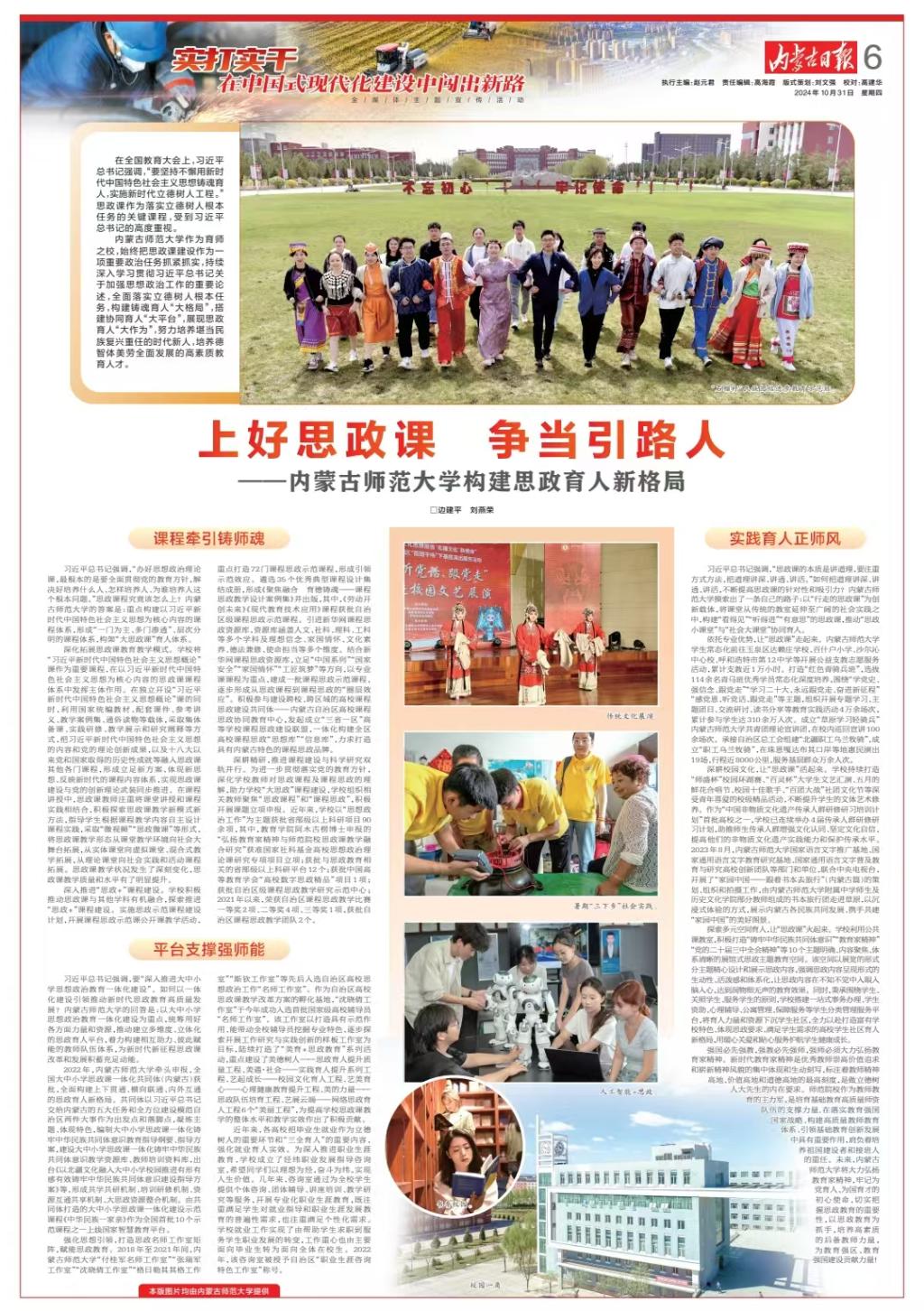 《内蒙古日报》2024年10月31日第6版以《上好思政课 争当引路人——beat365在线唯一官网构建思政育人新格局》为题,报道beat365思政教育工作。