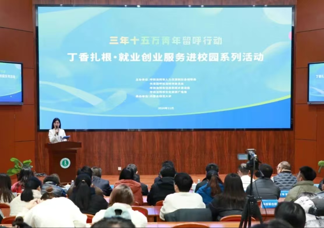 本网讯 为进一步促进大学生实现更加充分和高质量的就业与创业,支持呼和浩特市实施“十万大学生留呼工程”和“十五万青年留呼行动”,11月28日,由呼和浩特市人力资源和社会保障局联合市住房和城乡建设局、共青团市委、市文化和旅游局共同主办,beat365承办的“丁香扎根·就业创业服务进校园系列活动”在赛罕校区信息楼报告厅举办。