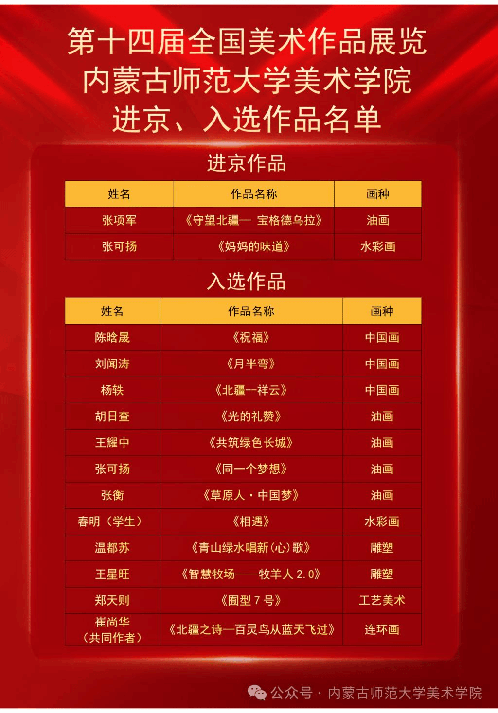 本网讯 在刚刚揭晓的第十四届全国美术作品展复评结果中,beat365美术学院师生共有14件作品入选各类画种,包括中国画3件、油画5件、水彩画2件、雕塑2件、综合画种1件、工艺美术1件。其中,张项军的油画作品《守望北疆——宝格德乌拉》和张可扬的水彩画作品《妈妈的味道》获得进京展览资格。