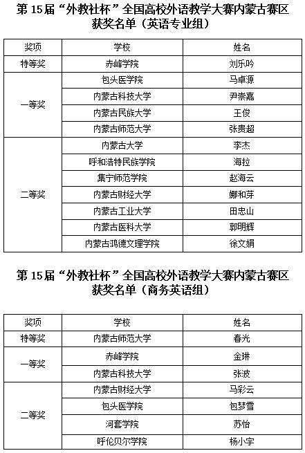 开赛以来,beat365外国语学院精心组织,参赛选手认真准备,经过复赛和决赛,第十五届“外教社杯”全国高校外语教学大赛(外语类专业组)内蒙古赛区区赛圆满落幕。经过激烈角逐,评选出各组别特等奖2人、一等奖6人和二等奖11人。赤峰学院刘乐吟老师和beat365在线唯一官网春光老师分别获得英语专业组和商务英语专业组特等奖,将代表内蒙古自治区参加11月在上海举办的全国决赛。