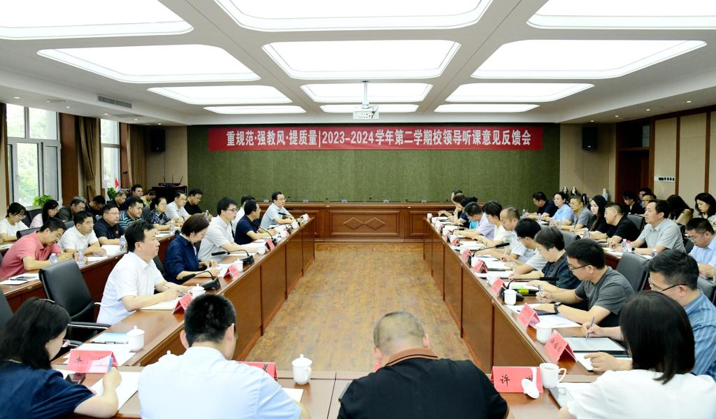 本网讯 为全面落实学生中心、产出导向、持续改进的理念,全面提升课堂教学质量和人才培养质量,培育构建“自觉、自省、自律、自查、自纠”高校质量建设文化,7月10日,学校召开2023-2024学年第二学期校领导听课意见反馈会。全体在校领导,各学院院长、教学副院长、专任教师代表以及相关职能部门负责同志和工作人员参加会议。