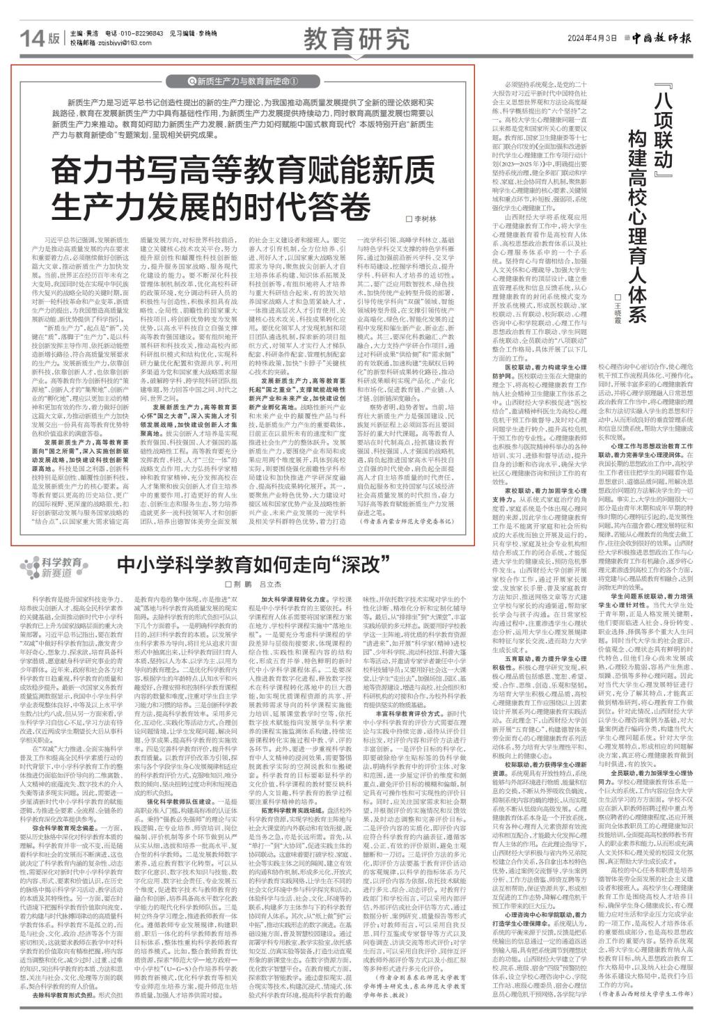 《中国教师报》4月3日第14版全文刊载beat365党委书记李树林署名文章《奋力书写高等教育赋能新质生产力发展的时代答卷》,全文如下。