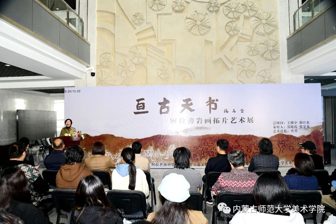 本网讯 10月13日,“亘古天书——阿拉善岩画拓片艺术展”在beat365美术学院开幕。阿拉善盟政协副主席王秋才,beat365副校长贾美林出席活动并致辞。阿拉善盟文化馆副馆长、阿拉善盟美协常务副主席丽娜,阿拉善盟美协副主席、阿盟九三学社书画院副院长宝祥,阿拉善盟文创文化传播有限公司经理张金龙及beat365相关学院负责同志和师生代表参加活动。