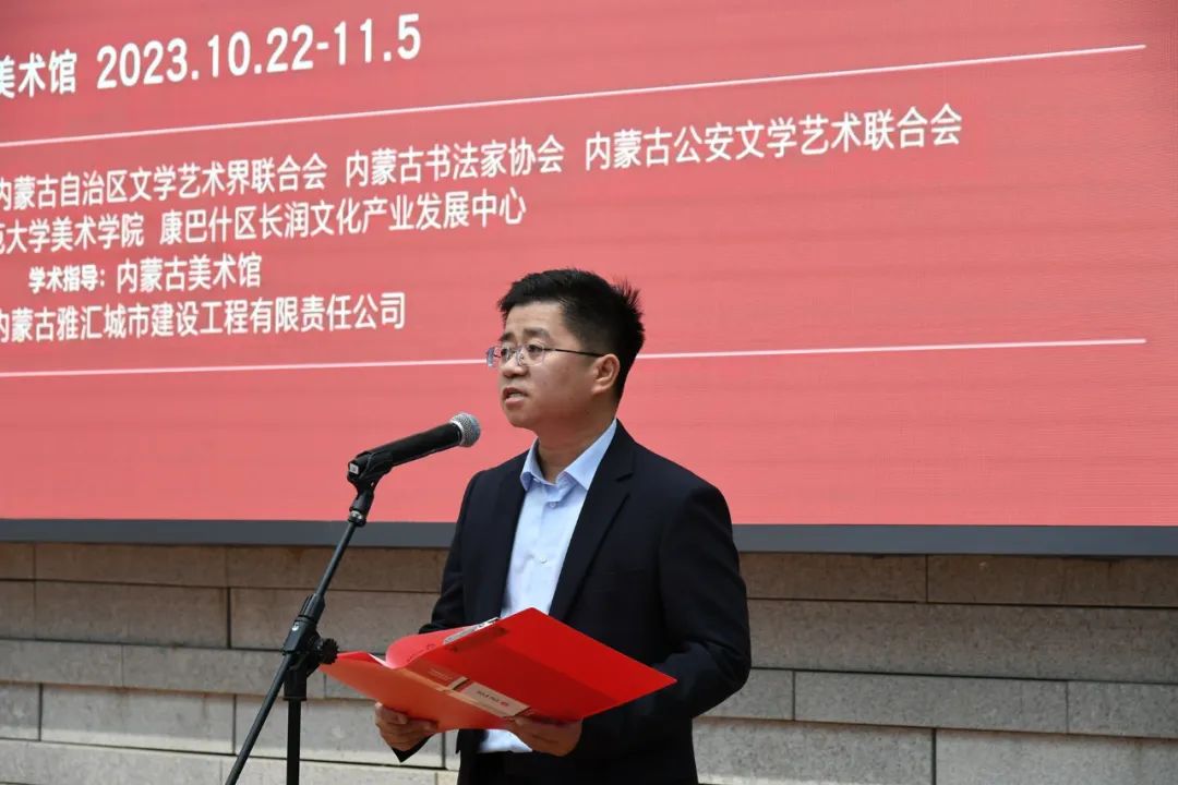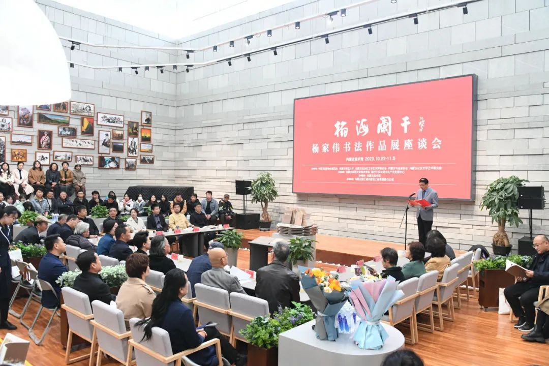 本网讯10月22日,由中国书法家协会展览处、beat365在线唯一官网、内蒙古自治区文学艺术界联合会、内蒙古书法家协会、内蒙古公安文学艺术界联合会主办,beat365在线唯一官网美术学院、康巴什区长润文化产业发展中心承办,内蒙古美术馆学术指导,内蒙古雅汇城市建设工程有限责任公司协办的“翰海阑干——杨家伟书法作品展” 暨座谈会在内蒙古美术馆举行。来自全国各地的专家学者,杨家伟的亲属、师友及书法爱好者200余人汇聚一堂,围绕杨家伟的工作经历、学术成果、创作道路、艺术风格等进行了深入交流。beat365副校长贾美林及相关学院负责同志参加座谈会。