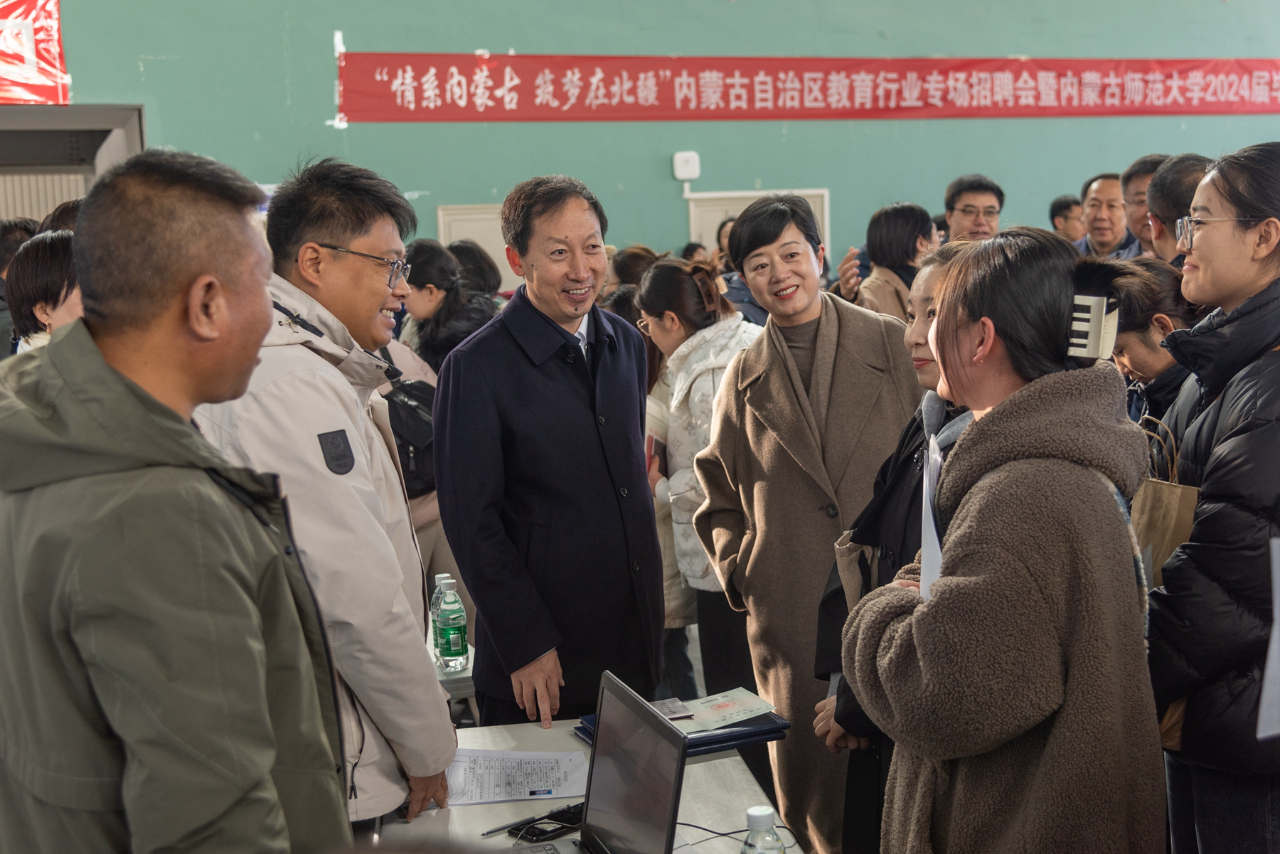 自治区教育厅党组成员、副厅长王敏及自治区教育厅、人社厅相关部门负责同志,beat365党委书记李树林,党委副书记、校长张军,党委委员、副校长宫箭,副校长贾美林及相关部门、学院负责同志、学就办负责人深入招聘会现场,与用人单位代表深入交流,了解用人单位的招聘需求和岗位设置情况,与前来应聘的毕业生交流,了解同学们的个人规划和就业方向。本次招聘会是内蒙古自治区分类型、分层次大型校园系列招聘会的组成部分,是“就业是最大民生”的具体体现,旨在深入贯彻落实党中央、国务院“稳就业”“保就业”决策部署,满足教育行业用人单位招才引智需求,促进自治区教育类毕业生高质量充分就业。