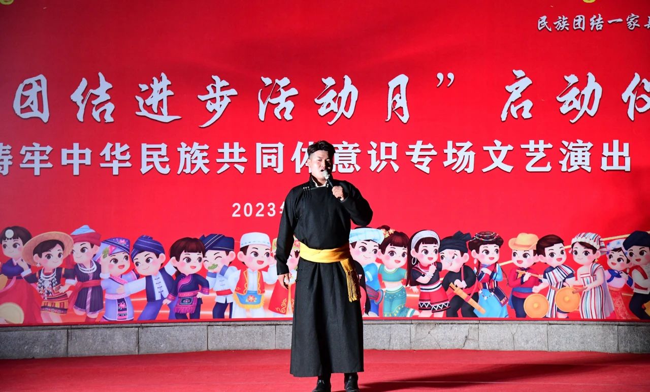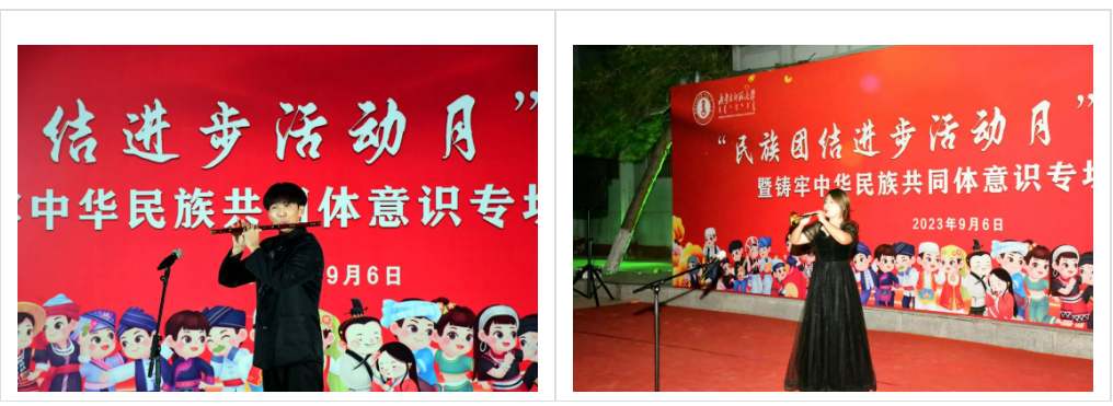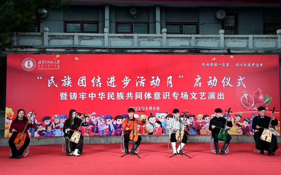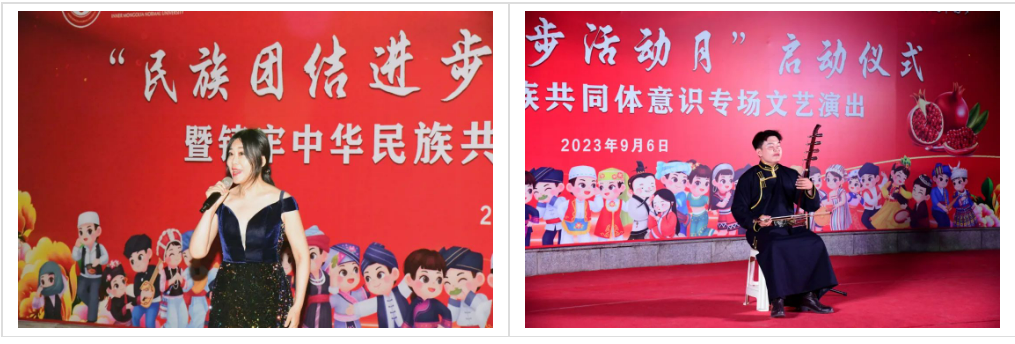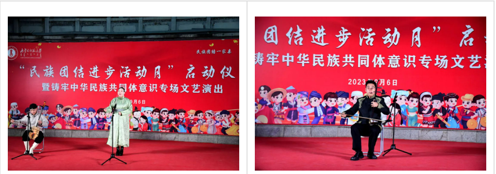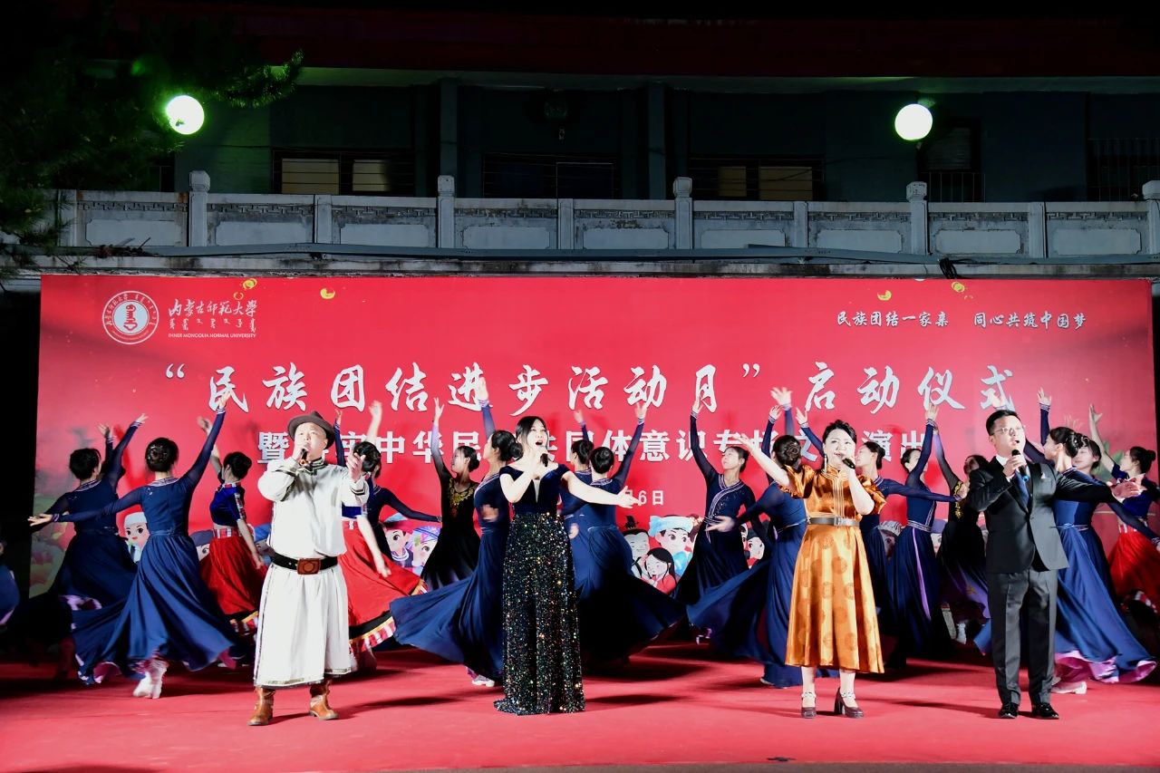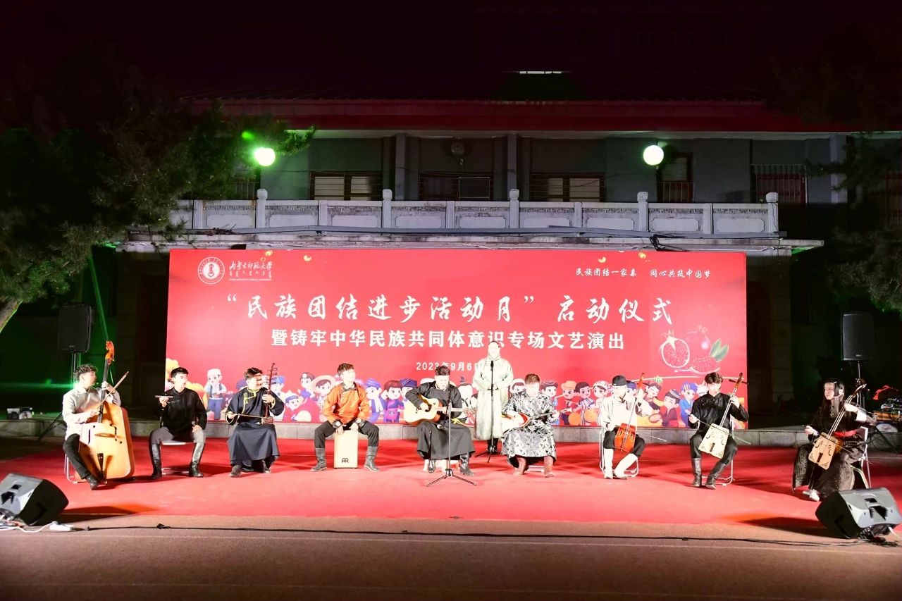 本次民族团结进步活动月在一场精彩纷呈的文艺演出中拉开序幕。《万马奔腾》《黑幕日》《褐色的雄鹰》《赛马》《共筑中国梦》《牧民新歌》《喜悦欢腾黑土地》等经典曲目轮番上演,将整场演出推向高潮。曲目或舒缓、或激昂,或低沉、或高亢,向观众展示着对天地自然的热爱,表达了对党和人民的真挚感情,以艺术独特的形式,教育引导广大师生增强中华文化认同,构筑中华民族共有精神家园,铸牢中华民族共同体意识。