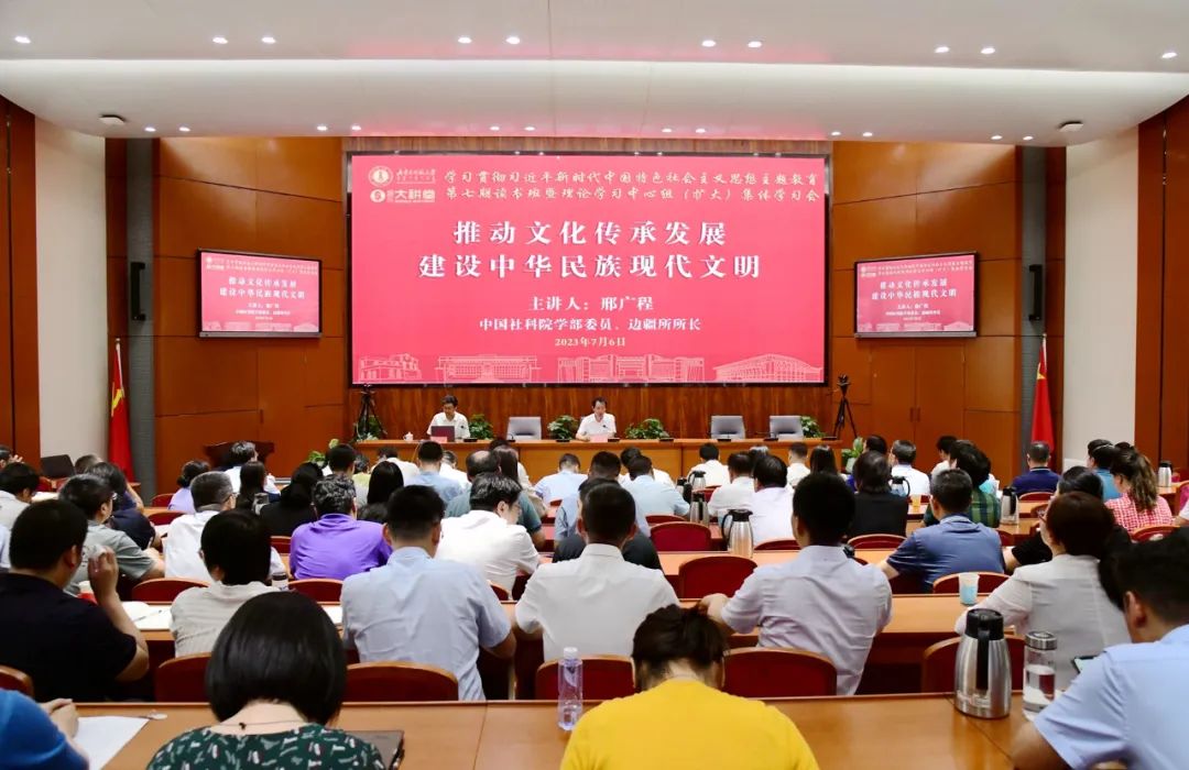 本网讯 近日,beat365在赛罕校区信息楼报告厅举办学习贯彻习近平新时代中国特色社会主义思想主题教育第七期读书班暨理论学习中心组(扩大)集体学习会,邀请中国历史研究院中国边疆研究所所长邢广程作了题为“推动文化传承发展,建设中华民族现代文明”的辅导报告。学校党委中心组成员、全校副处级以上干部、马克思主义学院教师和学生代表聆听了报告。报告会由党委书记李树林主持。