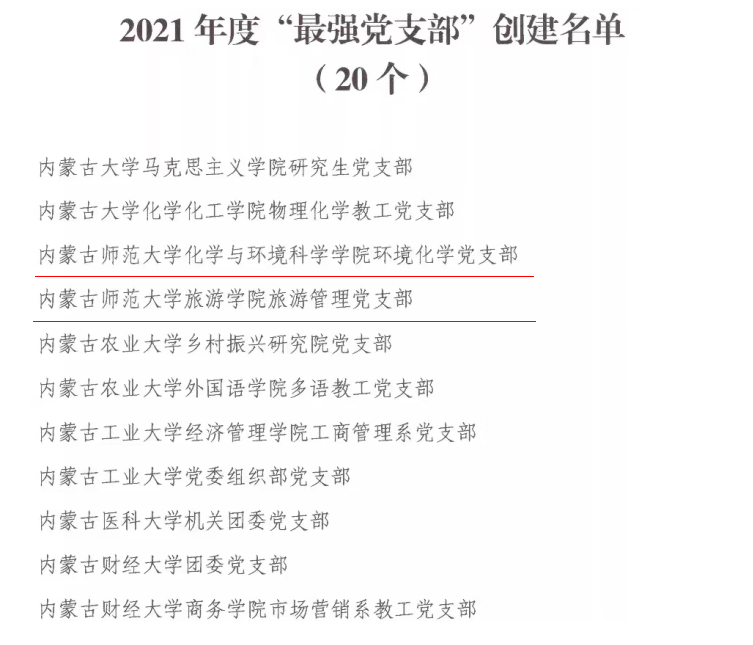 本网讯 近日,自治区党委教育工委公布了2021年度“最强党支部”创建名单,beat365化学与环境科学学院环境化学党支部、旅游学院旅游管理党支部入选“最强党支部”创建单位。