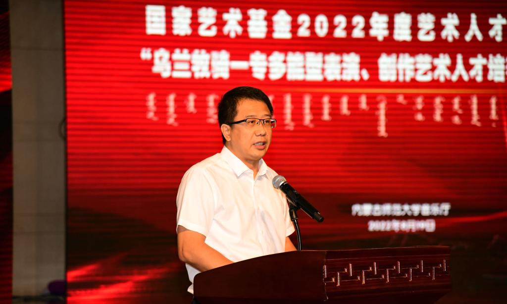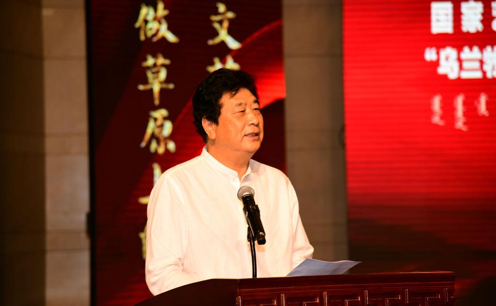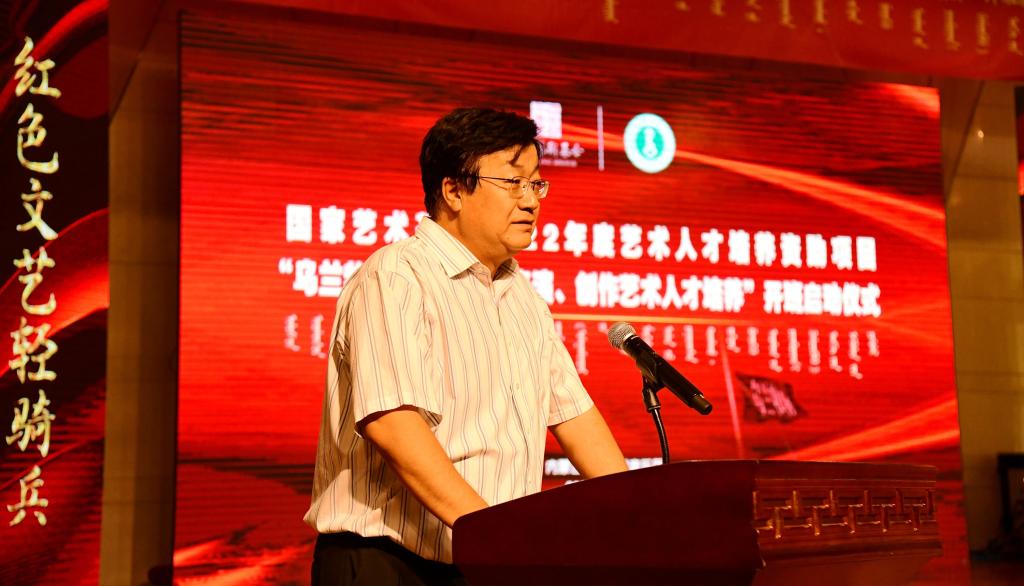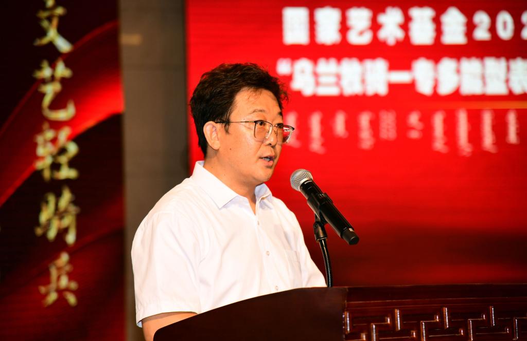 宫箭致开幕辞,他谈到,新时代的乌兰牧骑艺术要在不断汲取中华民族传统丰富营养、展示中华民族文化无限魅力的同时,不断创新和发展。项目团队要进一步挖掘和发扬乌兰牧骑文化传承与创新的功能,通过编创、排演、组合训练等方式,继续凝聚专业智慧,着力解决基层乌兰牧骑高层次专业人才不足的问题,要培养出能够真正“大力弘扬乌兰牧骑的优良传统,扎根生活沃土,服务牧民群众,推动文艺创新”的优秀艺术人才。