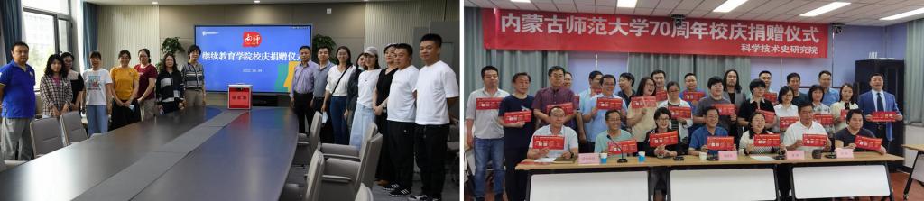 截至目前,后勤服务集团、纪委、监察专员办公室、心理学院、物理与电子信息学院、数学科学学院、化学与环境科学学院、生命科学与技术学院、音乐学院、附属学校、蒙古学学院、国际交流学院、继续教育学院、国际设计艺术学院、科学技术史研究院、经济管理学院、文学院、党委组织部、党委统战部、工会、国有资产管理处、财务处、学工部(学生工作处)、校庆办公室等单位先后开展了“我为母校献爱心”活动。