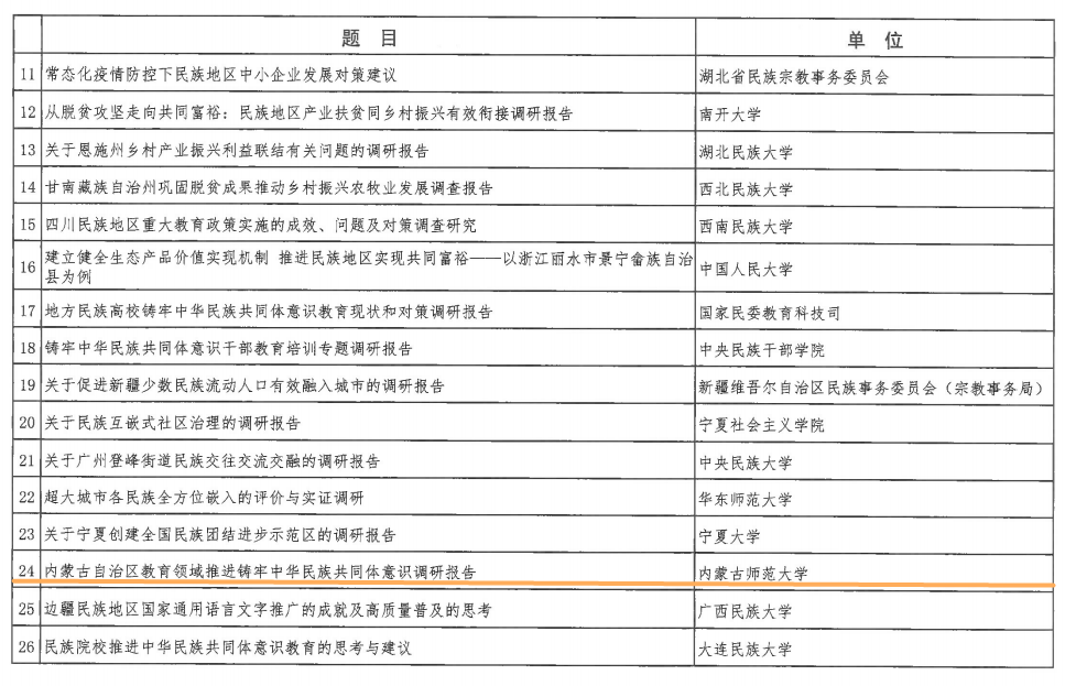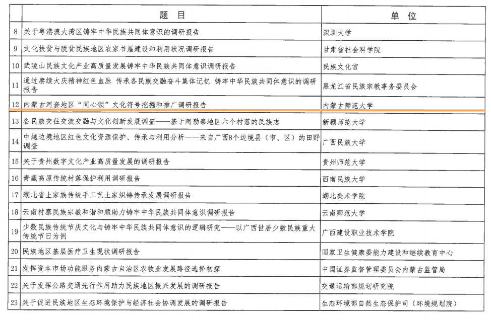 beat365申报的两篇调研报告成功入选获奖名单。其中,beat365党委书记阿拉坦仓主持的《内蒙古自治区教育领域推进铸牢中华民族共同体意识调研报告》荣获“二等奖”,民族学人类学学院教师张时空主持的《内蒙古河套地区“同心锁”文化符号挖掘和推广调研报告》荣获“优秀奖”。