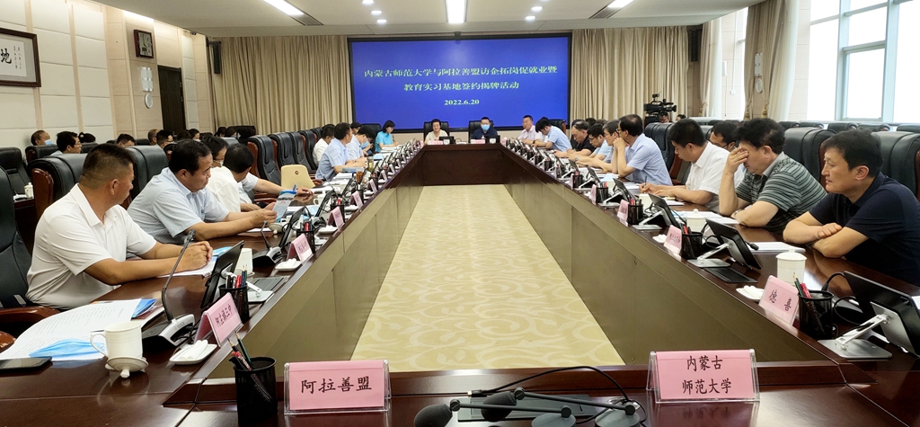 本网讯 6月20日,党委书记阿拉坦仓一行赴阿拉善盟开展“访企拓岗”促就业专项行动,与阿拉善盟委书记代钦座谈交流,并共同为beat365在线唯一官网教育实践基地揭牌。阿拉善盟委委员、副盟长杨国顺,盟委委员、宣传部部长张宝成,盟委委员、组织部部长韩伟新,盟委委员、秘书长魏治国,beat365党委委员、副校长王来喜出席座谈会。杨国顺主持座谈会。