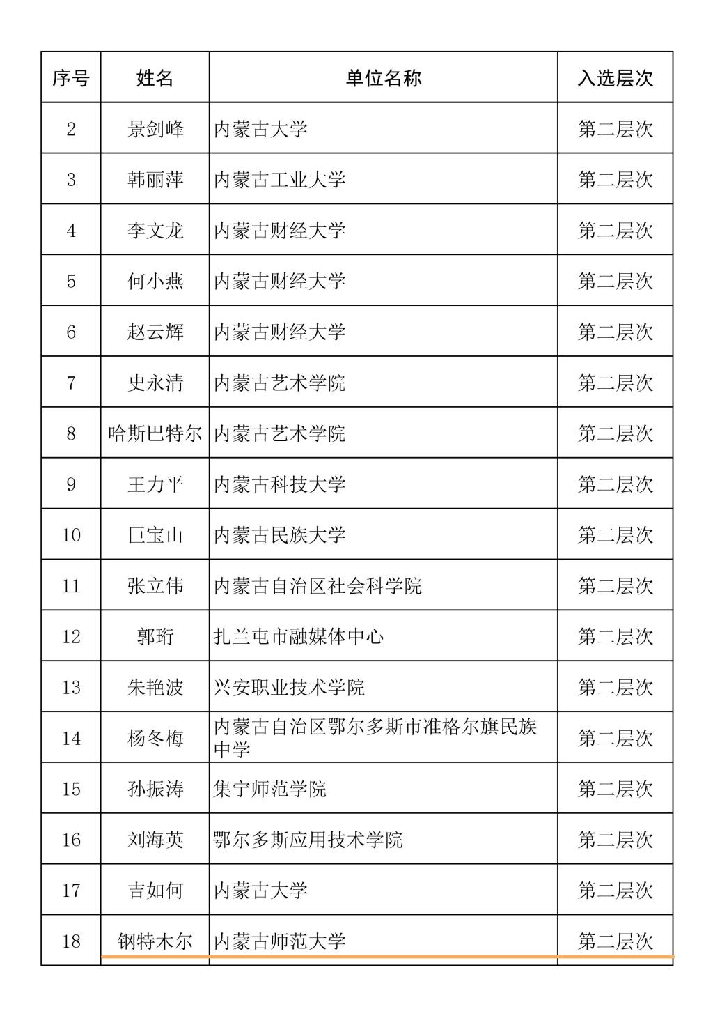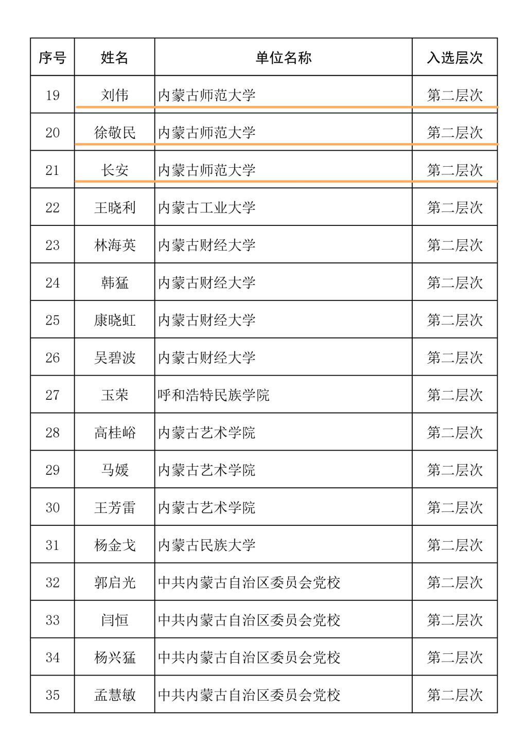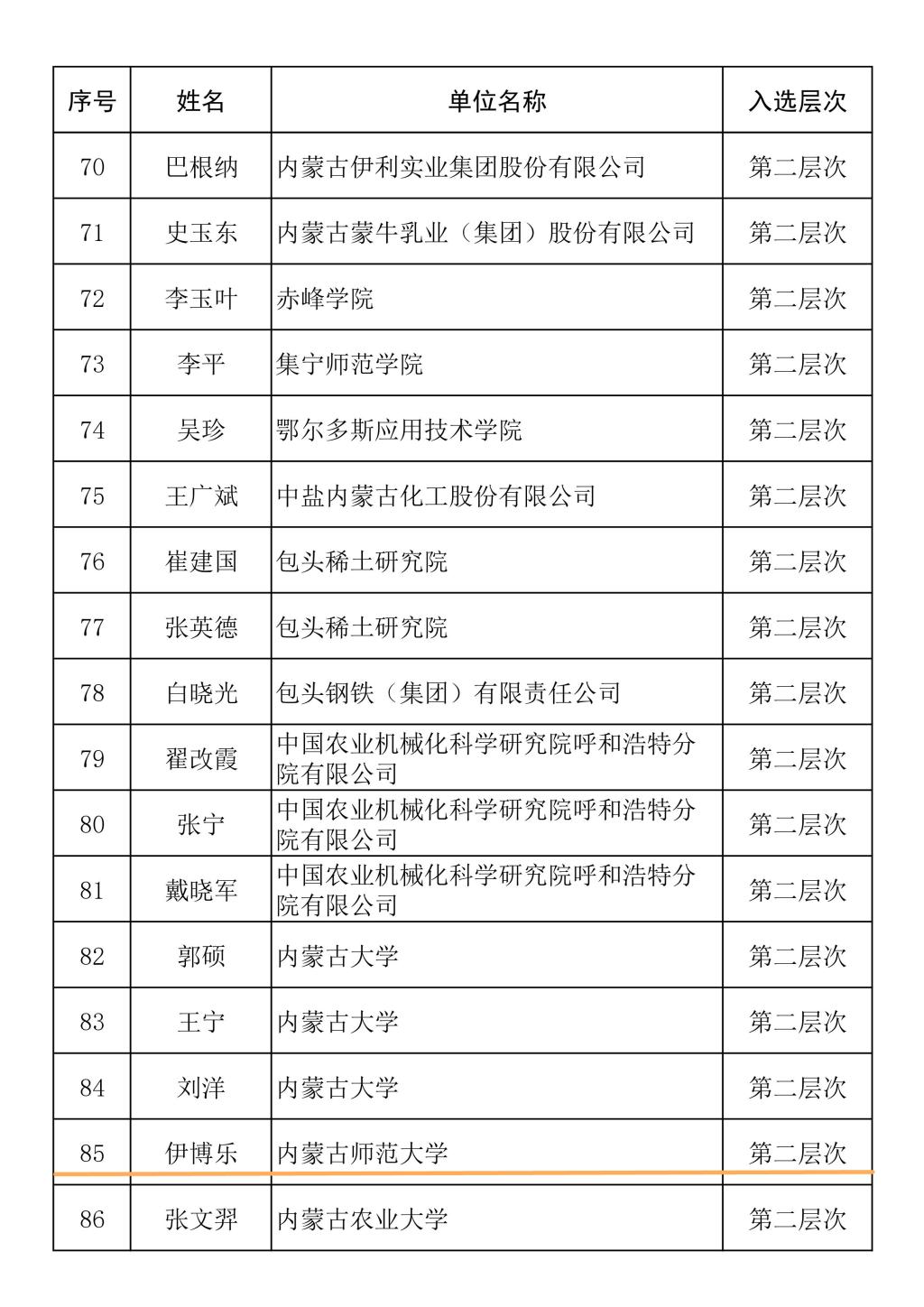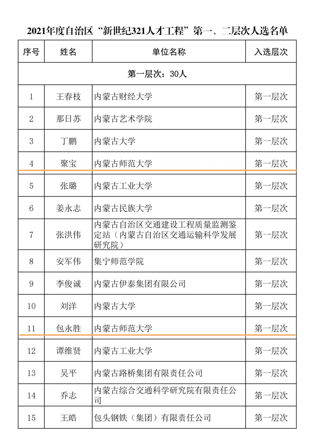 本网讯 按照《关于开展2021年自治区新世纪321人才工程第一、二层次人选考核选拔工作的通知》(内人社办发〔2021〕217号)有关要求,经各地区各部门申报推荐,自治区人力资源和社会保障厅组织专家评选,自治区新世纪321人才工程领导小组成员单位会议审议,1月10日,2021年度自治区新世纪321人才工程第一、二层次人选予以公示,beat365教师聚宝、包永胜入选第一层次人选公示名单,钢特木尔、刘伟、徐敬民、长安、杨艳春、李艳玲、伊博乐入选第二层次人选公示名单。