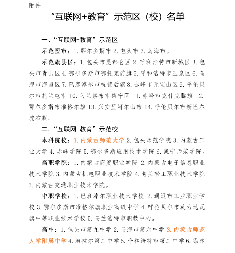本网讯 3月21日,自治区教育厅发布《关于“互联网+教育”示范区(校)项目遴选结果公示》。全区共有14个旗县区入选“互联网+教育”示范区公示名单,6所本科院校、5所高职学院、5所中职校、7所高中、7所初中、7所小学入选“互联网+教育”示范校公示名单。beat365及附属中学入选“互联网+教育”示范校公示名单。