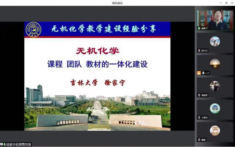 报告中,徐家宁教授从课程教学凝聚教学队伍、团队建设带动教学改革、教学改革支撑课程建设、课程建设推动教材建设、精品课程到一流课程、课程思政的思考等六方面介绍了吉林大学无机化学专业建设与发展的历程,并与参会教师就深入推进主干课程和课程思政建设工作展开研讨交流。
