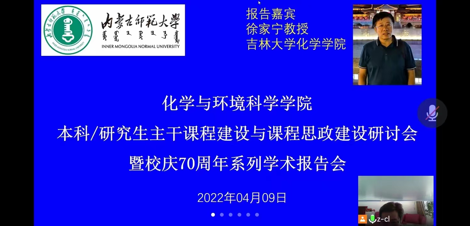 本网讯 4月9日上午,化学与环境科学学院本科和研究生主干课程建设与课程思政建设研讨会暨校庆70周年系列学术报告会在线上举行。会议邀请吉林大学国家“万人计划”教学名师、国家级精品课程负责人、国家级教学团队负责人徐家宁教授作了题为“无机化学主干课程一体化建设”的主旨报告。校党委书记阿拉坦仓、副校长张海峰出席会议。相关部门负责同志及教师代表参加会议。会议由化学与环境科学学院院长詹传郎主持。