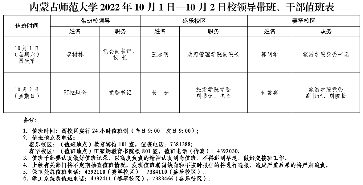 (五)各单位务于9月30日下午下班前将本单位值班表报党政办公室(盛乐校区行政楼212室,联系人:刘一雄,电话:7383723;赛罕校区田家炳教育书院楼713室,联系人:张妍,电话:4392036)和保卫处(盛乐校区创业楼值班室、赛罕校区保卫处楼值班室)。值班人员要保持通讯畅通,如遇到突发情况要及时上报并妥善处理,并配合学校总值班室做好各项工作。
