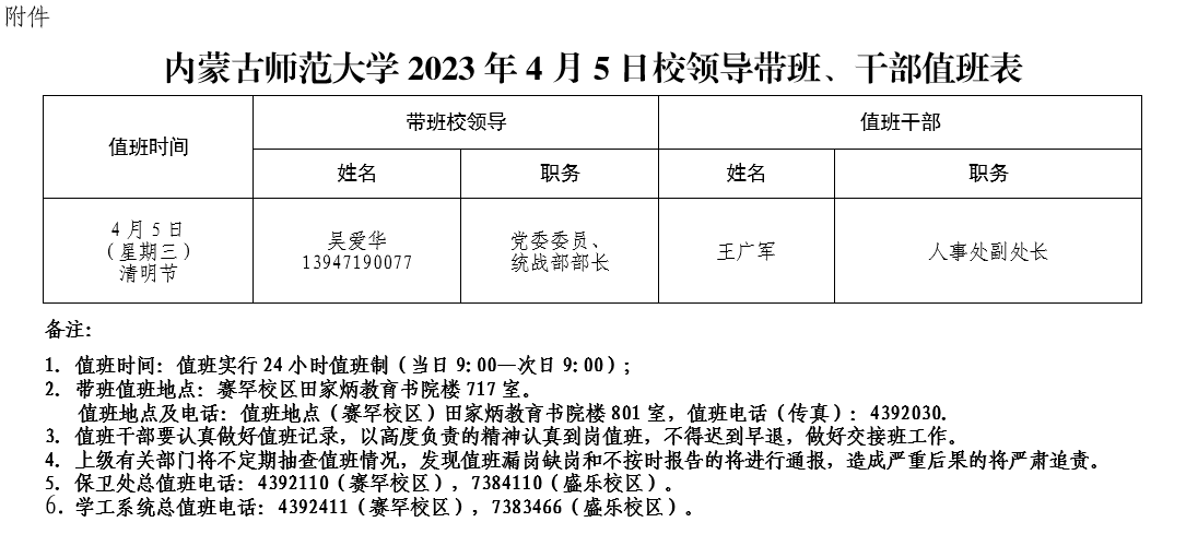 附件:beat365在线唯一官网2023年4月5日校领导带班、干部值班表