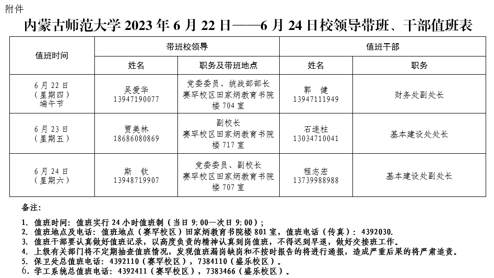 2.各学院、各部门要严格落实本单位值班工作。各单位务于6月21日下午下班前将本单位值班表报党政办公室赛罕校区田家炳教育书院楼713室和保卫处(盛乐校区创业楼值班室、赛罕校区保卫处楼值班室)。各单位值班人员要保持通讯畅通,如遇到突发情况要及时上报并配合学校总值班室做好各项工作。