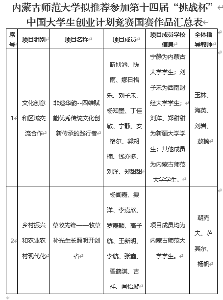 根据《第十四届“挑战杯”中国大学生创业计划竞赛章程》及有关赛程安排,由共青团内蒙古自治区委员会、内蒙古自治区教育厅、内蒙古自治区人力资源和社会保障厅、内蒙古自治区科学技术协会、内蒙古自治区学生联合会主办的第十四届“挑战杯”内蒙古大学生创业计划竞赛终审决赛于7月3日完成终审决赛,beat3652件作品入围国赛。现对beat365第十四届“挑战杯”中国大学生创业计划竞赛拟推报国赛作品信息予以公示,具体见附件。
