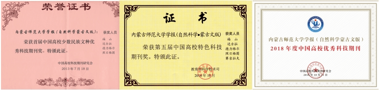 本刊多次被评为“内蒙古高校优秀学报”“全国高校自然科学优秀学报”。2013年,被中国高校科技期刊研究会评为“首届中国高校少数民族文种优秀科技期刊”。2014年,被教育部科技司评为“第五届中国高校特色科技期刊奖”。2018年,被中国高校科技期刊研究会评为“2018年度中国高校优秀科技期刊”。