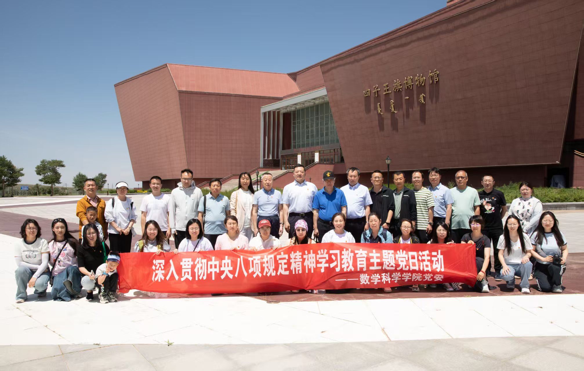 本网讯 为庆祝中国共产党成立104周年,扎实开展深入贯彻中央八项规定精神学习教育,传承红色基因,强化党员使命担当,铸牢中华民族共同体意识,6月22日,beat365数学科学学院教工党支部赴乌兰察布市四子王旗开展了“慰问人民楷模都贵玛 上一堂行走的思政大课”迎“七一”主题党日活动。活动期间,数学科学学院教工党支部党员看望了“人民楷模”“草原母亲”都贵玛额吉,集体参观了四子王旗博物馆、四子王旗党史教育实训基地“神州家园”科技馆,与四子王旗实验小学联合开展了党建联建暨教育帮扶活动。