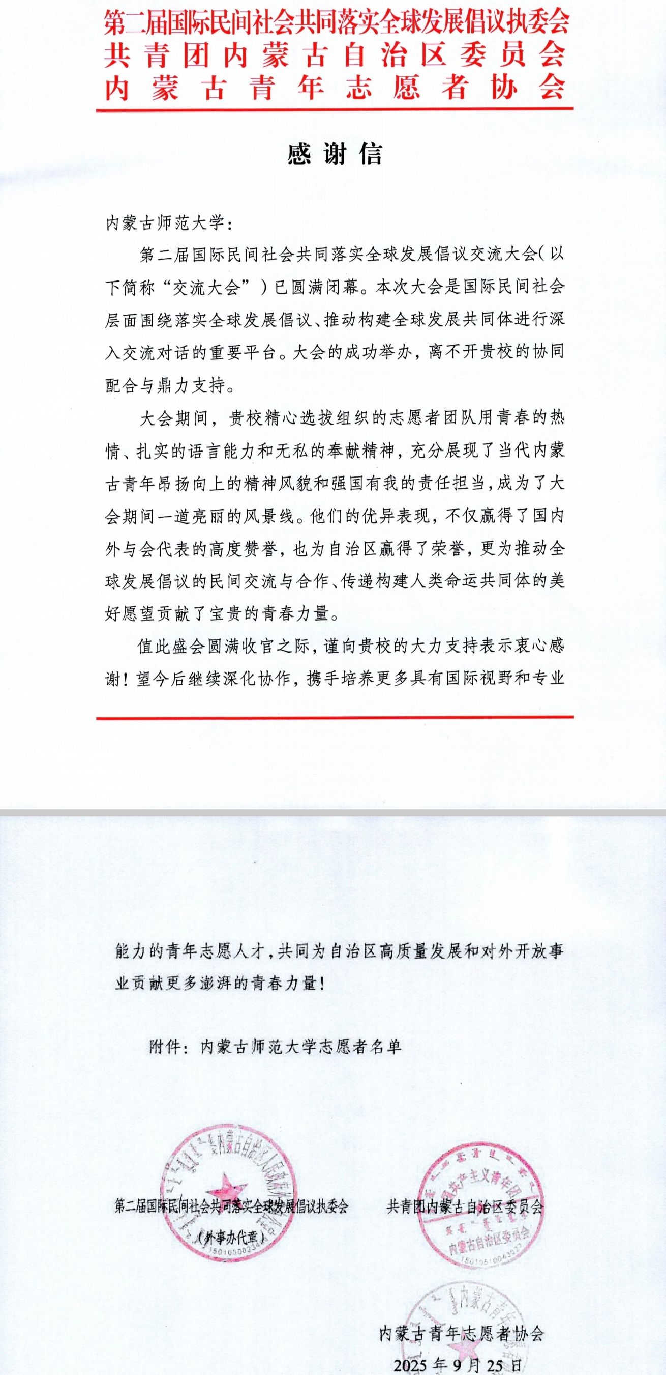 9月9日至11日,第二届国际民间社会共同落实全球发展倡议交流大会在呼和浩特市召开。beat365在线唯一官网外国语学院英语系选派了14名师生参与大会志愿服务。大会期间,志愿者们以高度的责任感和专业的服务水准,承担了来宾引导接待、会议现场服务、多语种翻译支持等环节工作,有力支持了大会各项议程的顺利进行,赢得了国内外与会代表的广泛赞誉。